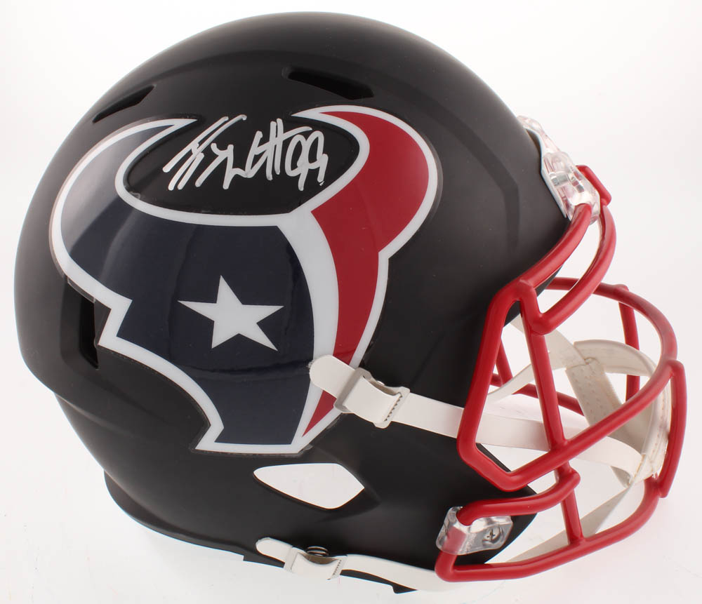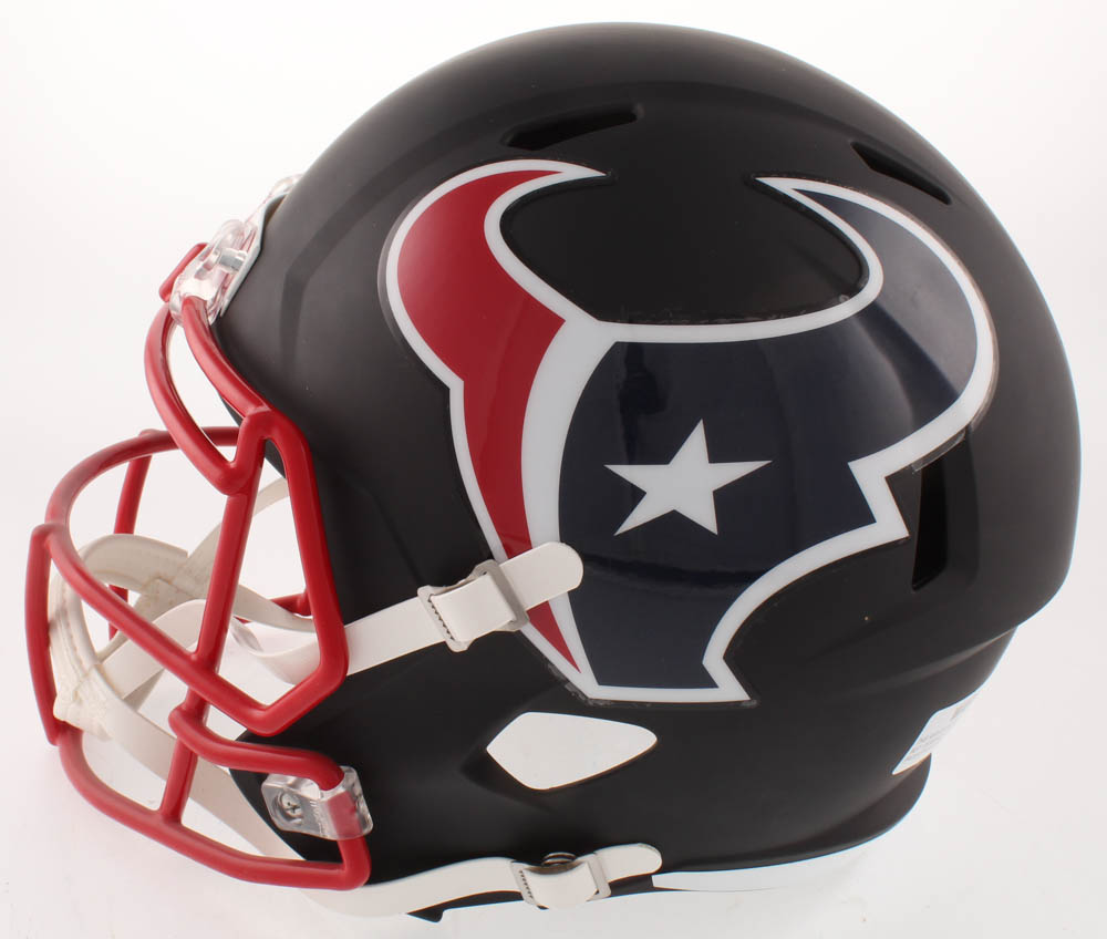 Riddell Houston Texans full-size matt black replica speed helmet. Hand-signed in silver paint pen by J.J. Watt.