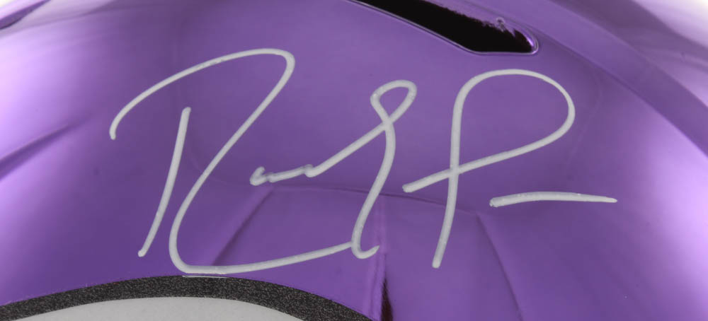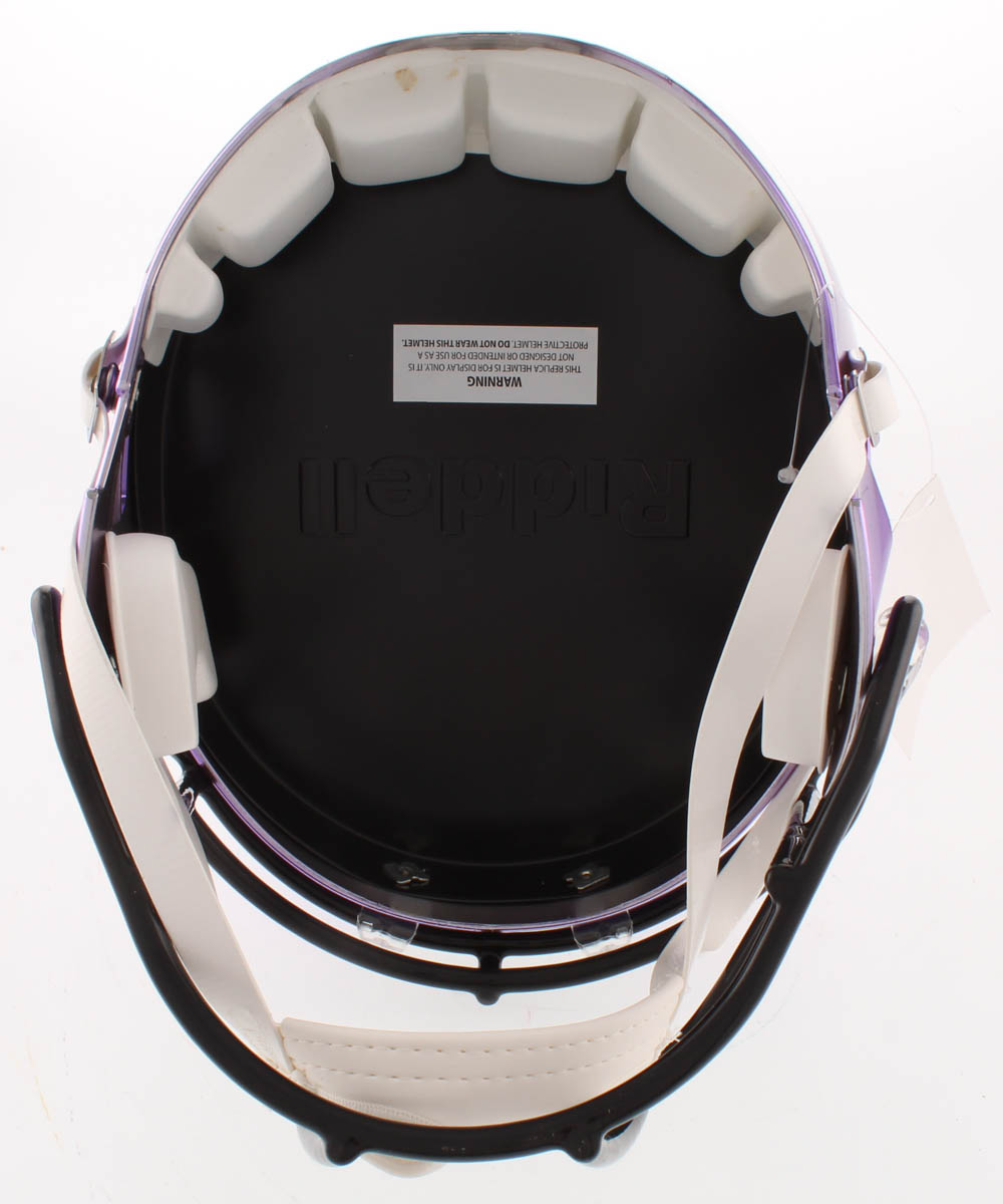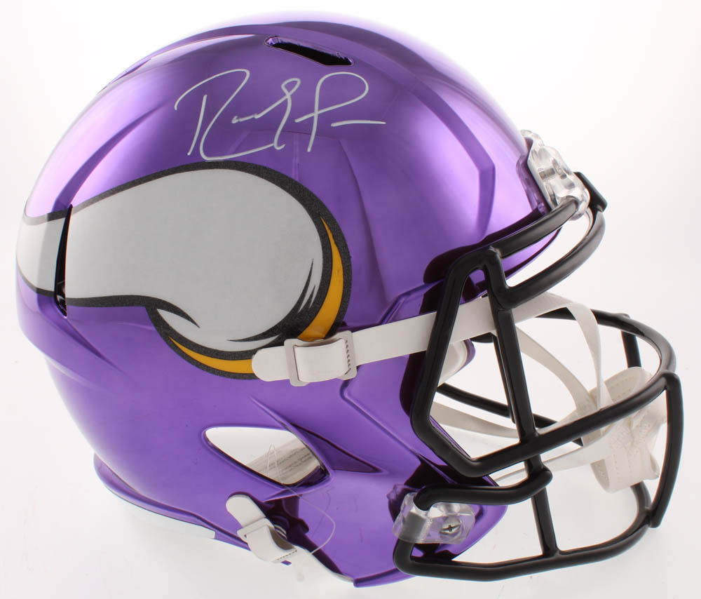 Riddell Minnesota Vikings full-size replica chrome speed helmet. Helmet has been hand-signed in silver paint pen by Randy Moss (HOF).