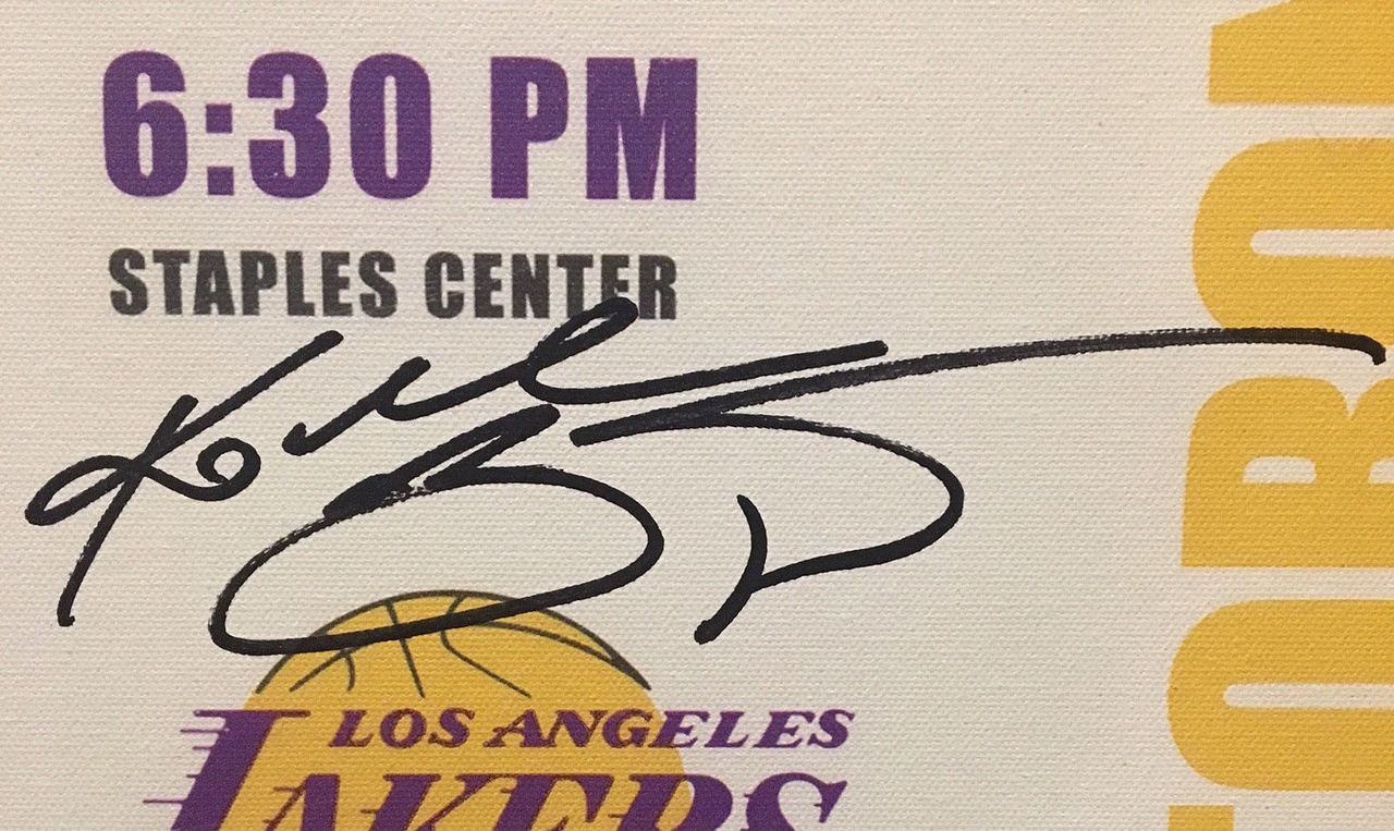 Oversized ticket on canvas measures 9" x 33" in size. Hand-signed in black felt-tip pen by Kobe Bryant (Lakers). The canvas is a limited edition and has been hand-numbered #1/24.