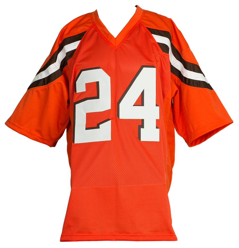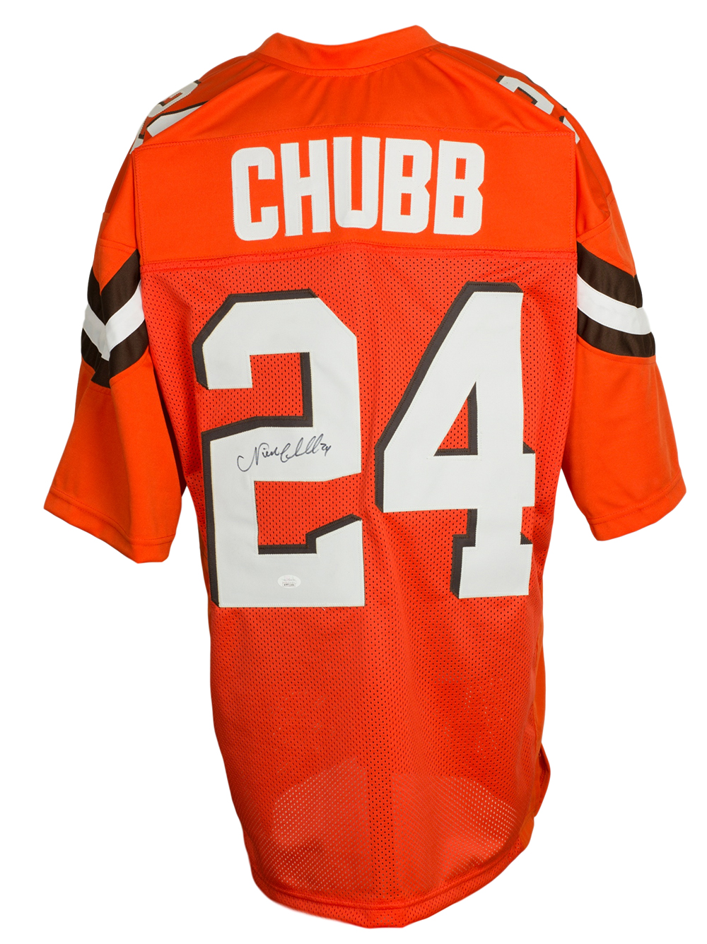 Custom on-field style jersey. Everything is sewn on, size XL. Hand-signed in black felt-tip pen by Nick Chubb.