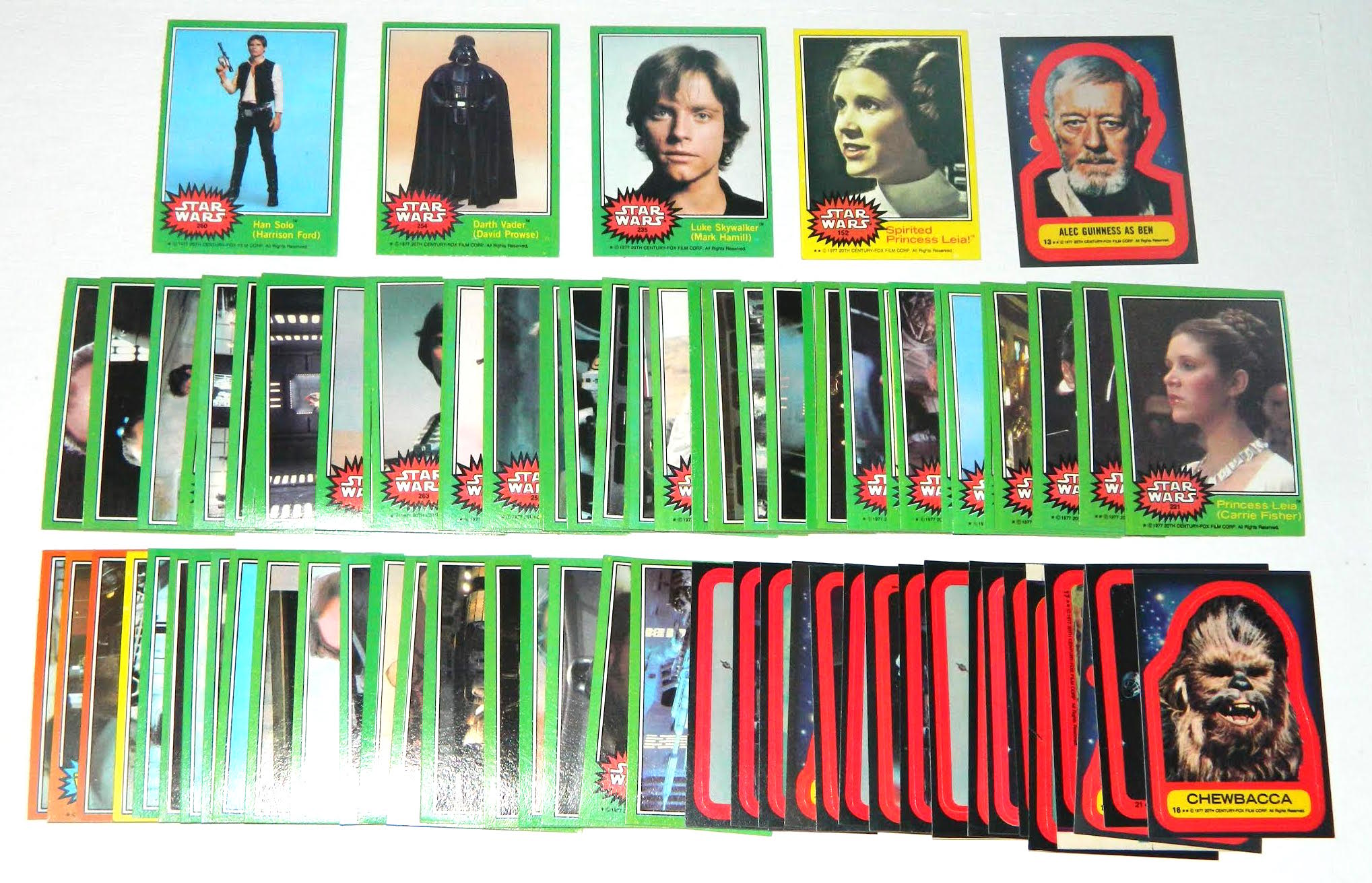 Lot of (86) 1977 Star Wars Cards with #260 Han Solo, #254 Darth Vader. #235 Luke Skywalker, #152 Spirited Princess Leia, #13 Alec Guiness as Ben OPC Sticker