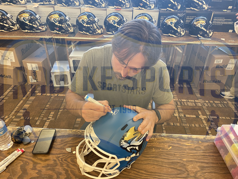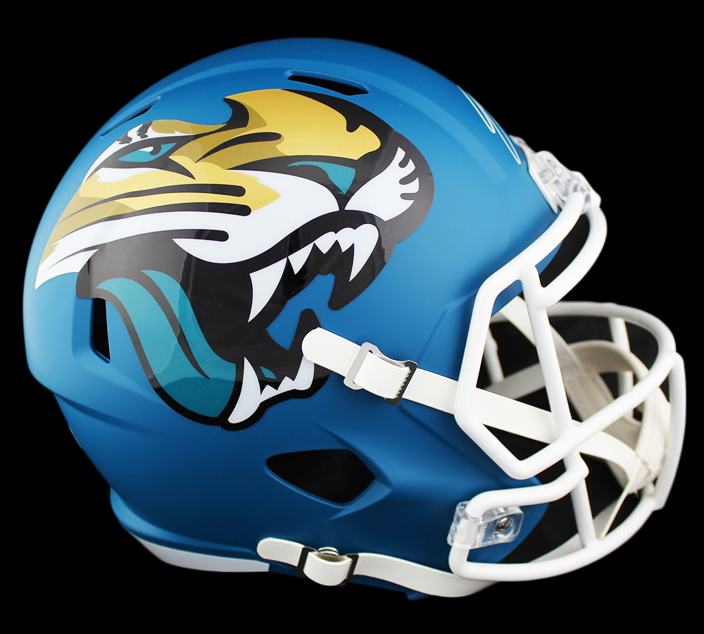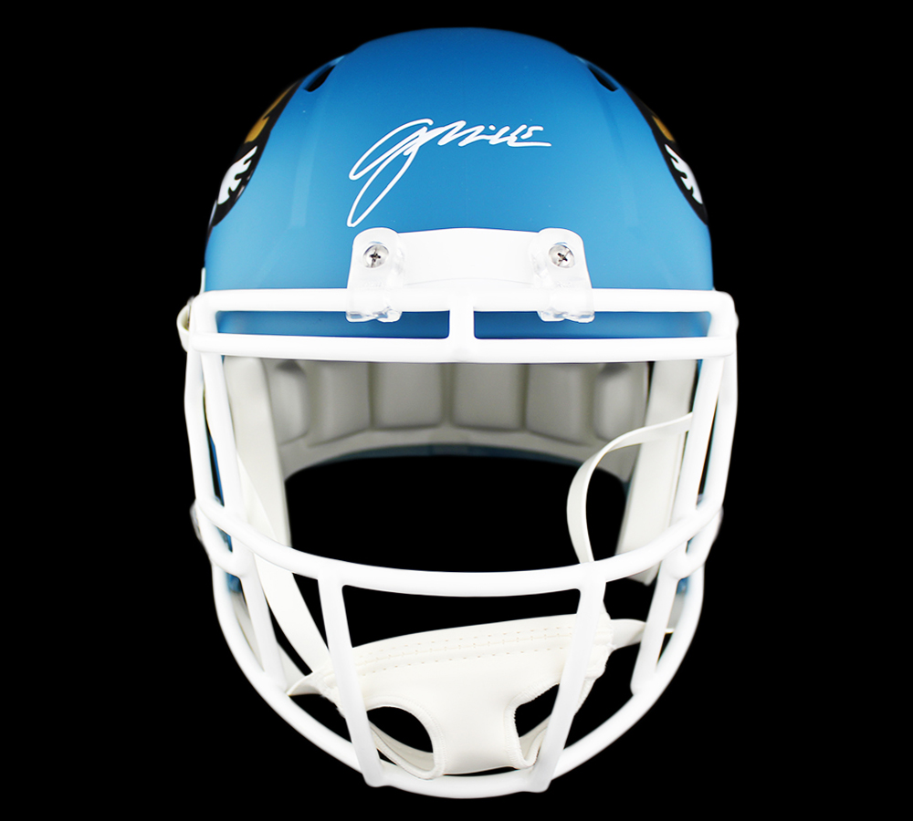 Riddell Jacksonville Jaguars full-size replica AMP Alternate Speed helmet. Hand-signed in white paint pen by Gardner Minshew