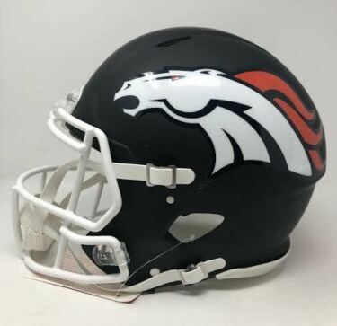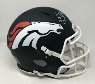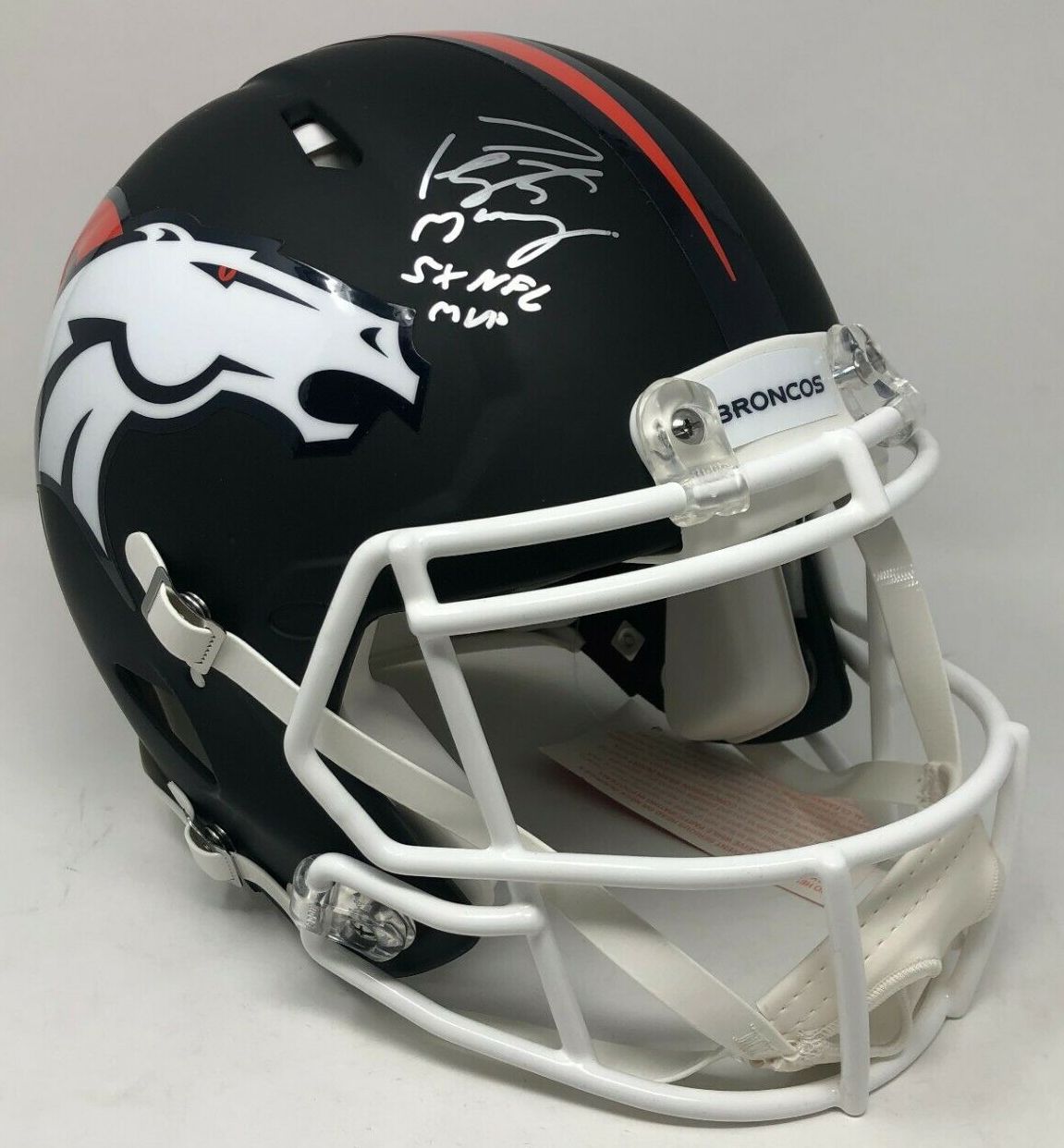 Denver Broncos full-size authentic on-field matte black speed helmet has been hand-signed and inscribed in silver paint pen by Peyton Manning. The helmet is a limited edition and has been hand-numbered #/18.