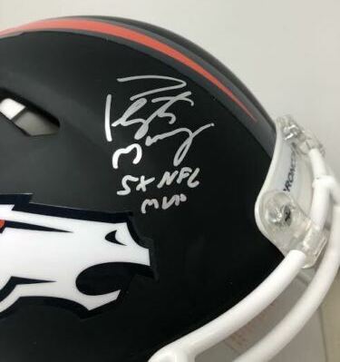 This authentic Broncos black matte helmet has been personally hand-signed and inscribed "5x NFL MVP" by Peyton Manning. It is officially licensed by the National Football League and comes with an individually numbered, tamper-evident hologram from Fanatics Authentic. To ensure authenticity, the hologram can be reviewed online. This process helps to ensure that the product purchased is authentic and eliminates any possibility of duplication or fraud. This helmet is limited to 18 and you will receive a random number from the edition.