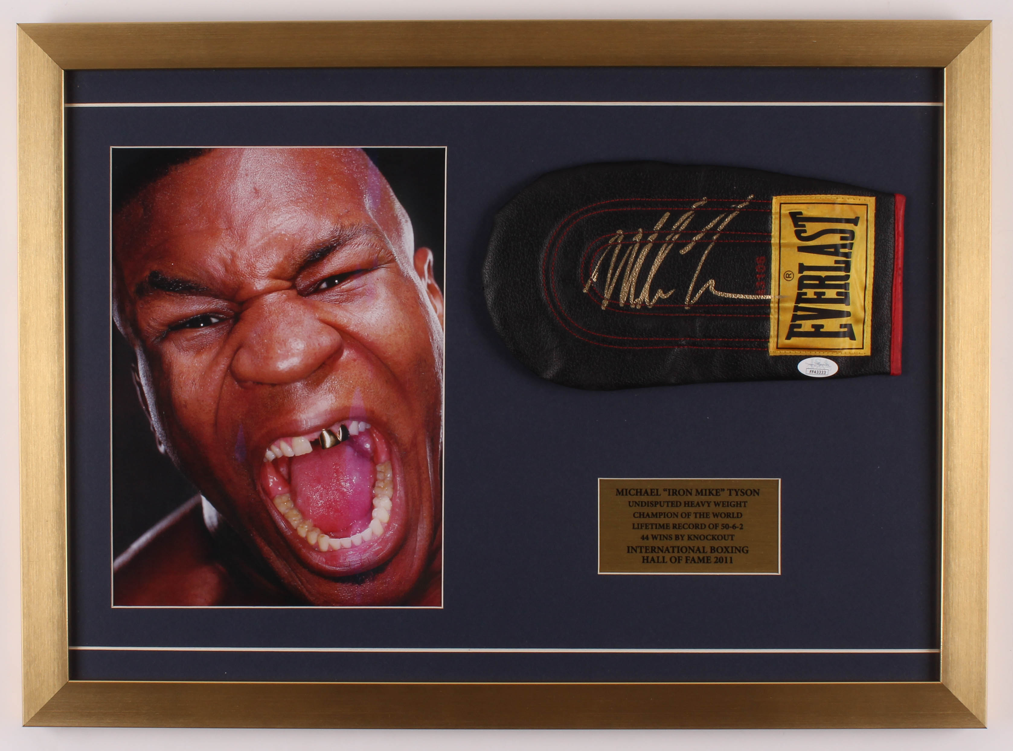 Custom frame measures 17.5" x 24" in size. Features an Everlast sparring glove that has been hand-signed in gold paint pen by Mike Tyson (HOF).