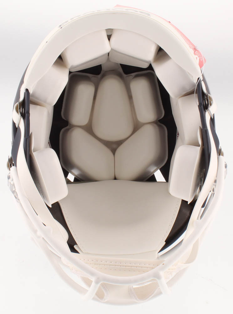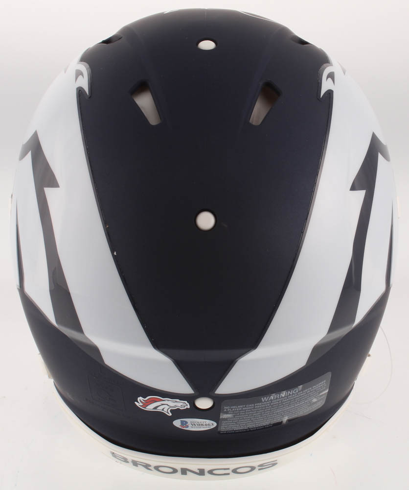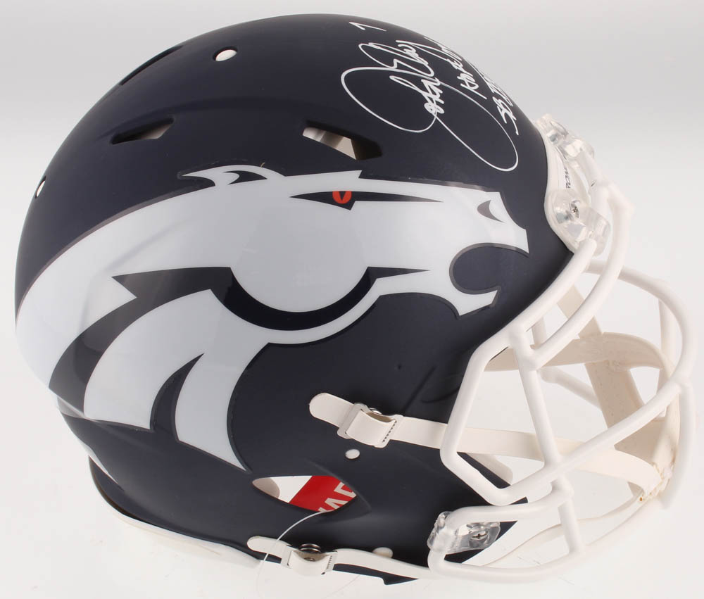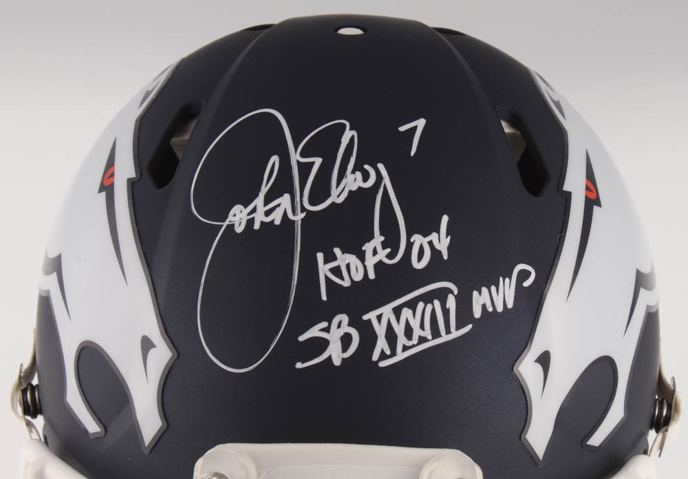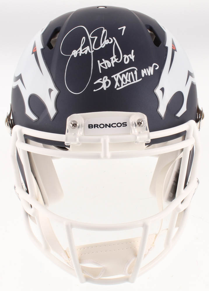 Denver Broncos full-size authentic on-field AMP Alternate Speed helmet. Hand-signed in white paint pen by John Elway (HOF).