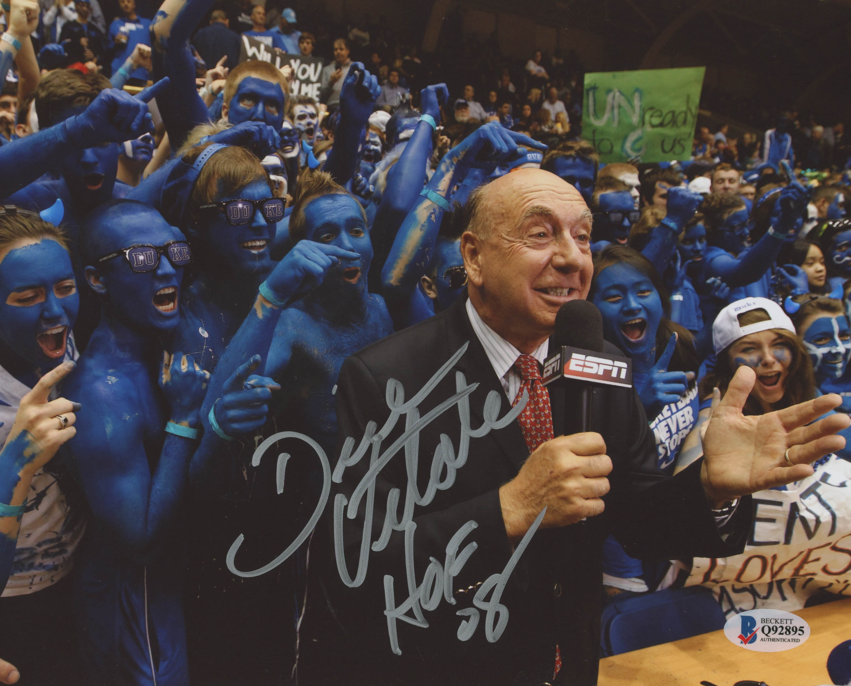 Photo measures 8" x 10" in size and has been hand signed in silver paint pen by Dick Vitale (HOF).