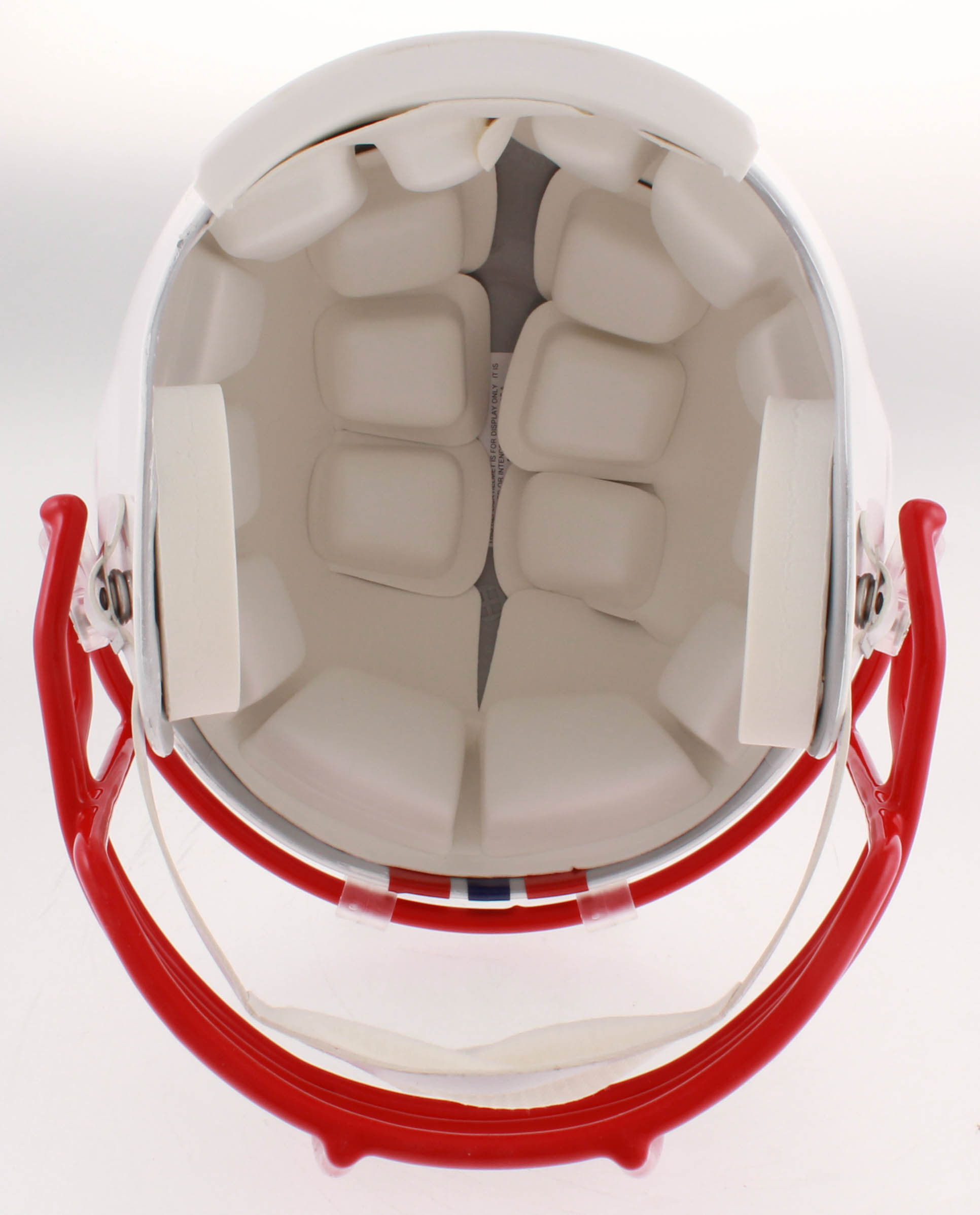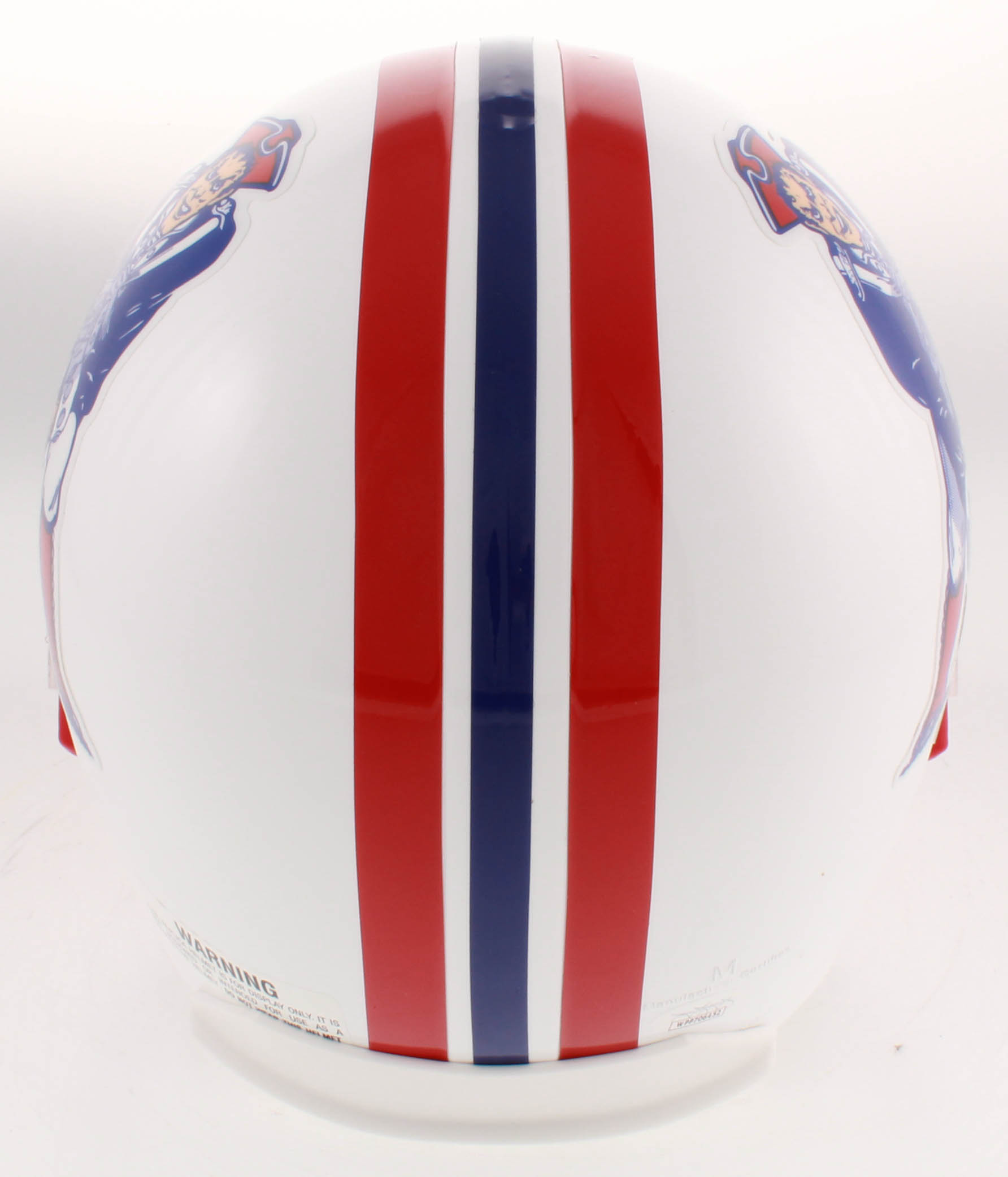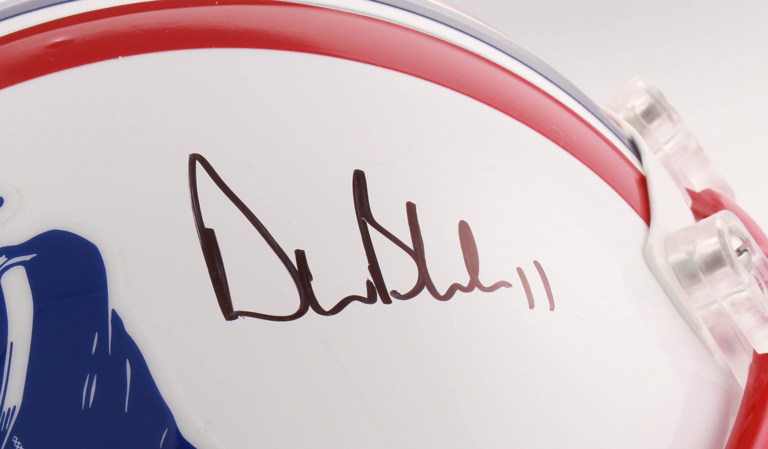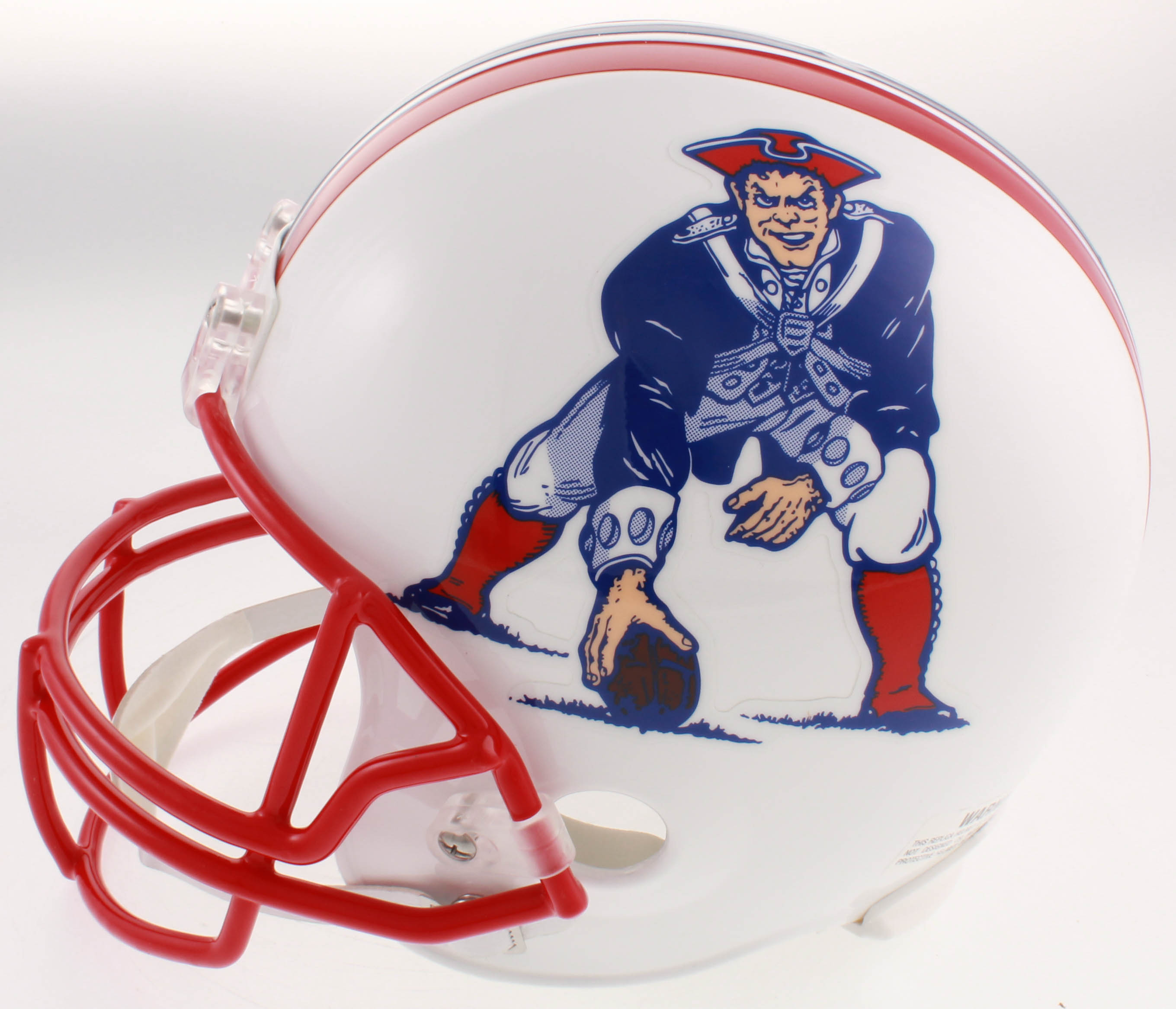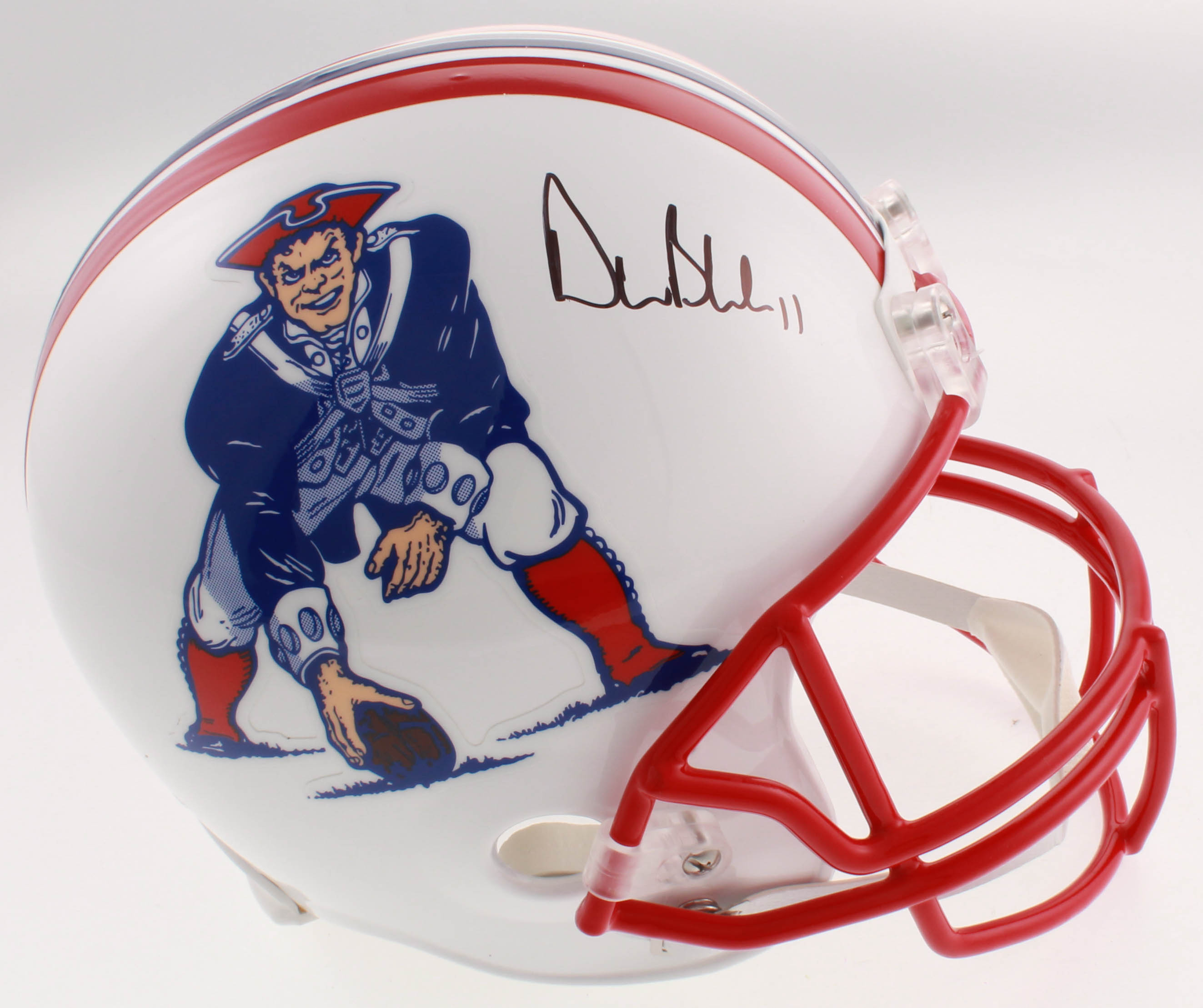 Riddell New England Patriots throwback full-size replica helmet has been hand-signed in black felt-tip pen by Drew Bledsoe.