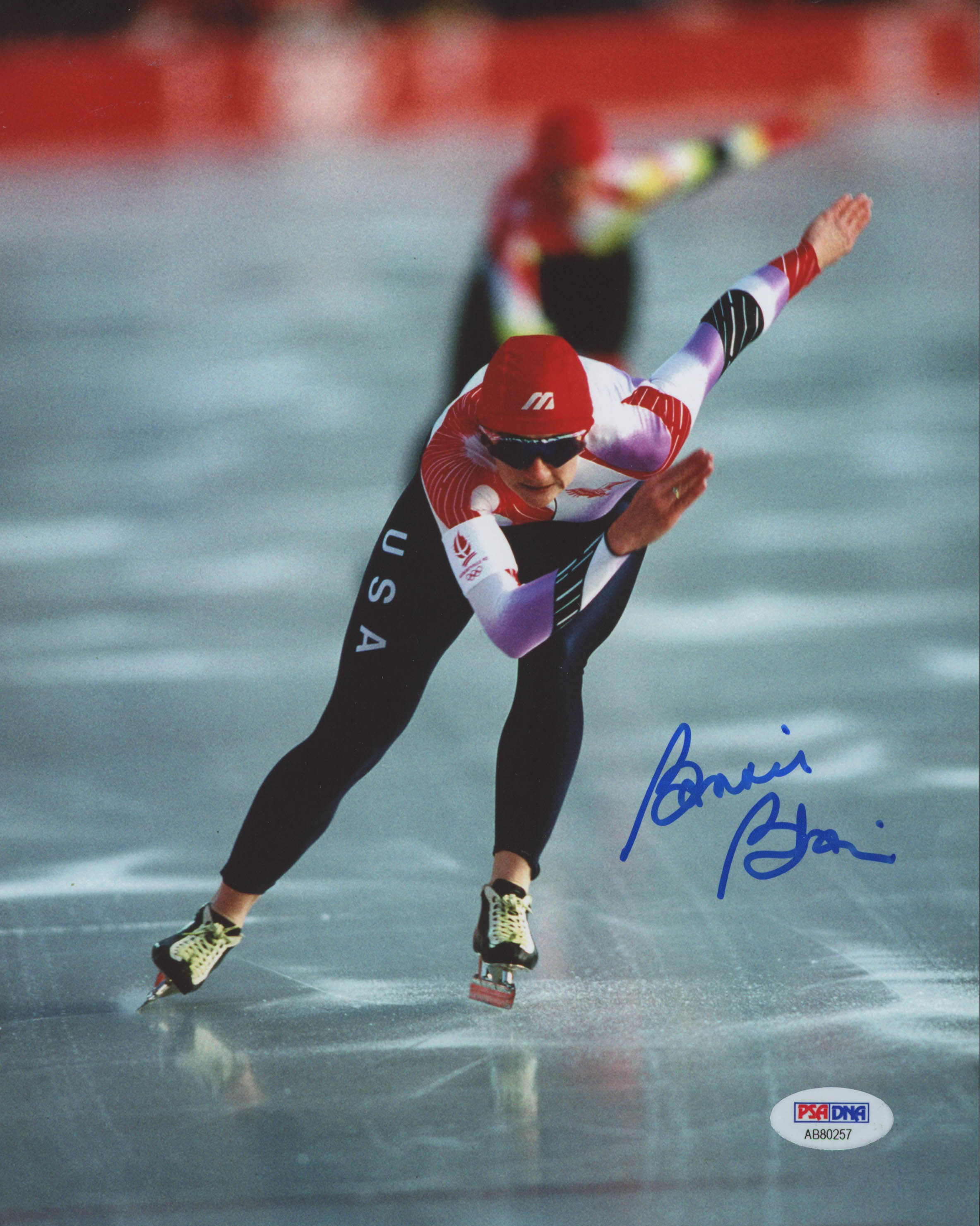 Photo measures 8" x 10" in size and has been hand-signed in blue felt-tip pen by Bonnie Blair.