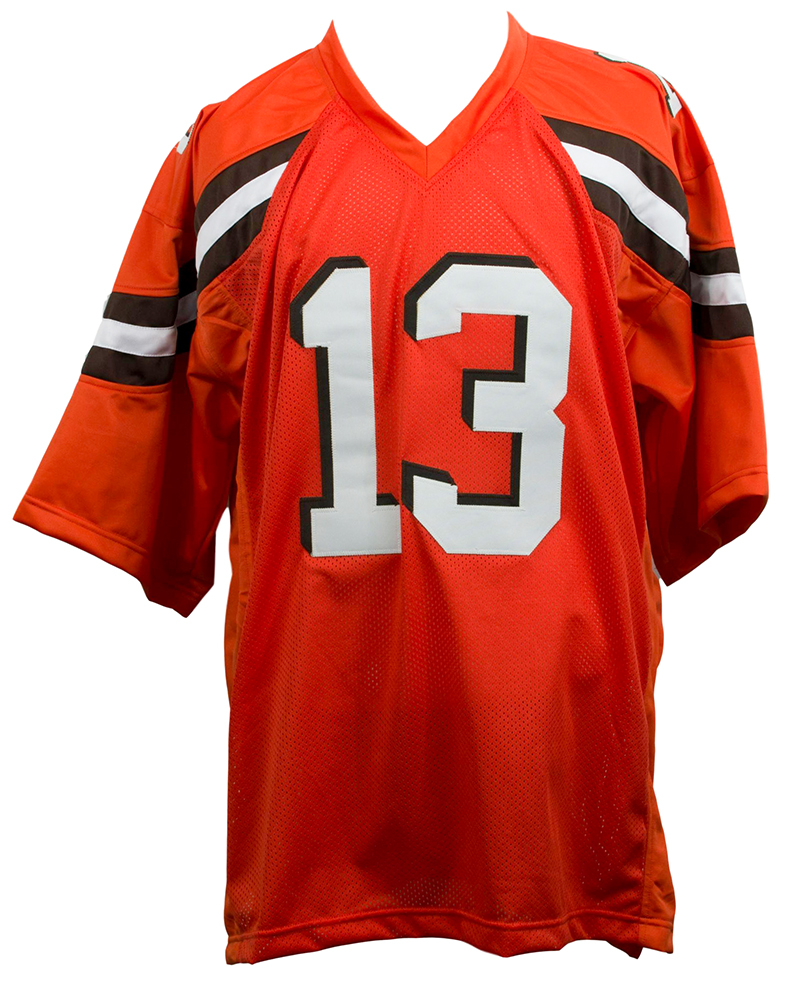Custom on-field style jersey with everything sewn on, size XL. Jersey has been hand-signed in black felt-tip pen by Odell Beckham Jr.