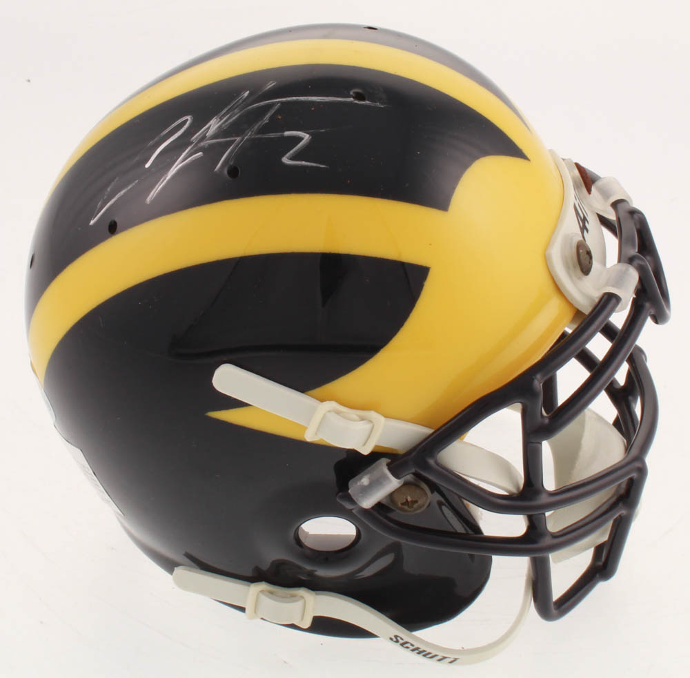 Schutt Michigan Wolverines mini helmet. Hand-signed in silver paint pen by Charles Woodson.
