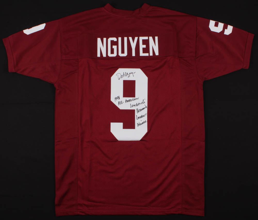 Custom on-field style jersey. Everything sewn on, size XL. Hand-signed in black felt-tip pen by Dat Nguyen.