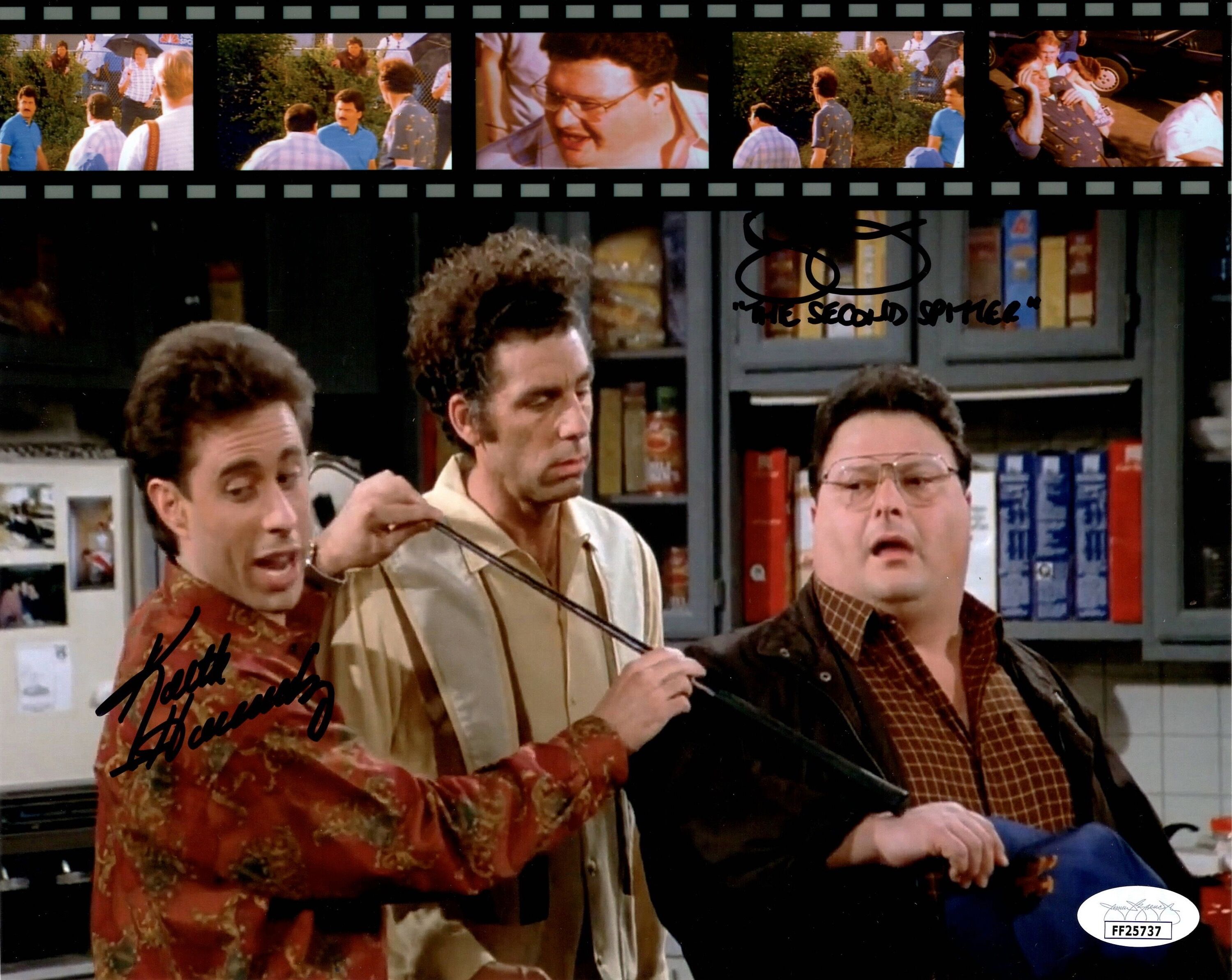 McDowell has inscribed the famous expression “The Second Spitter”. “Kramer” Michael Richards and Newman “Wayne Knight” accuse Keith of spitting on them after a past Mets game by the players parking lot at Shea Stadium; however, Jerry Seinfeld supports a "second-spitter theory" in which Keith is not involved: This is an obvious reference to the Single-bullet Theory analysis to which JFK assassination conspiracy buffs have historically drawn attention. Part 1 of "The Boyfriend" (also known as "The New Friend") episode of the sitcom Seinfeld from 1992. Authenticated by JSA with their hologram and accompanying COA # FF25737.