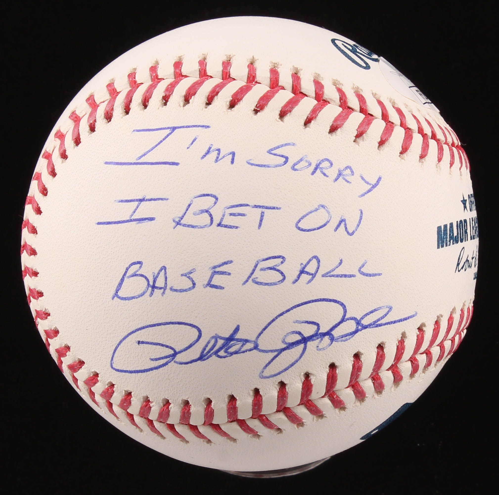 Rawlings Official Major League Baseball has been hand-signed in blue ink pen by Pete Rose (Cinncinati Reds).