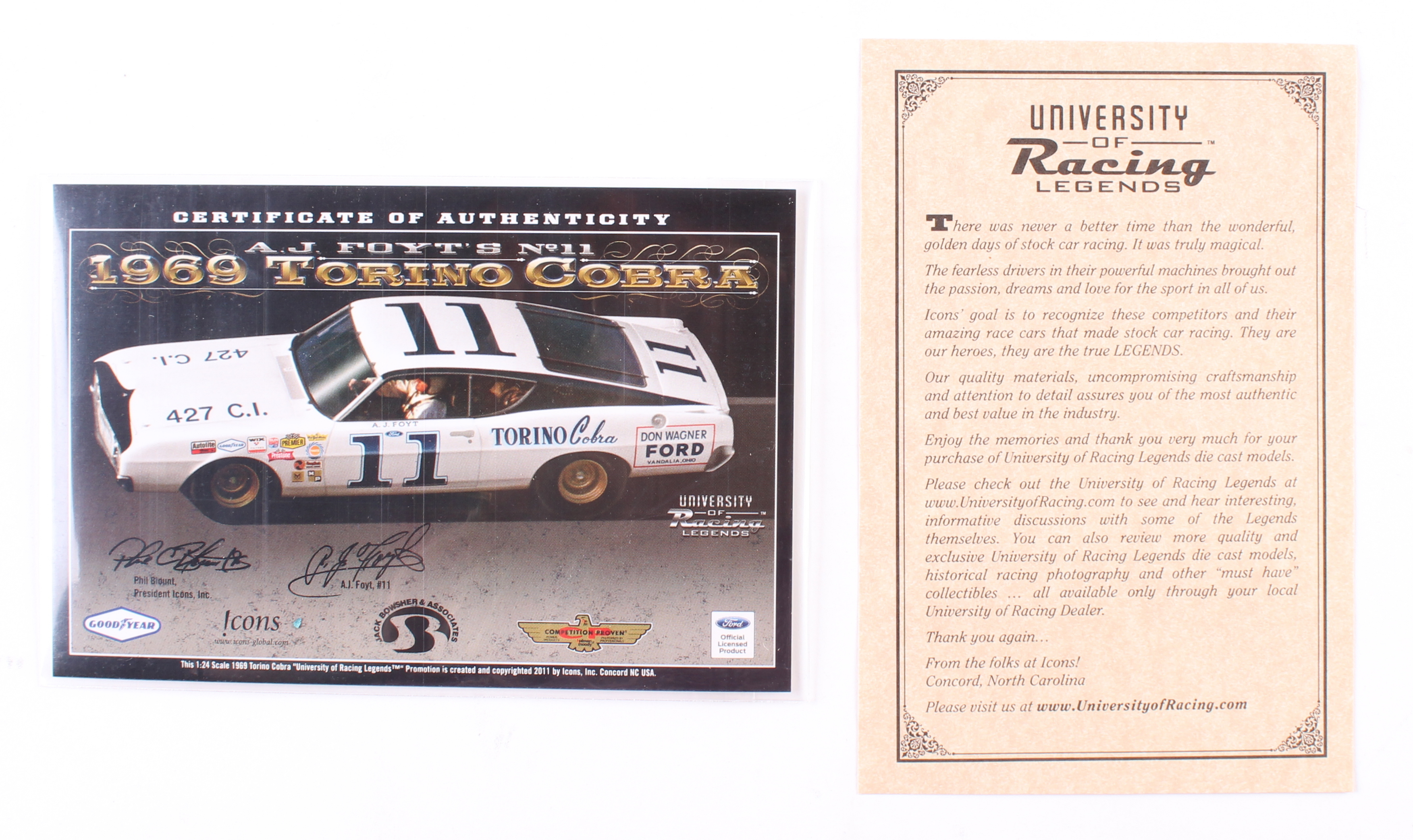 A.J. Foyt Signed NASCAR #11 1969 Torino Cobra 1:24 Premium Diecast Car (PA COA)