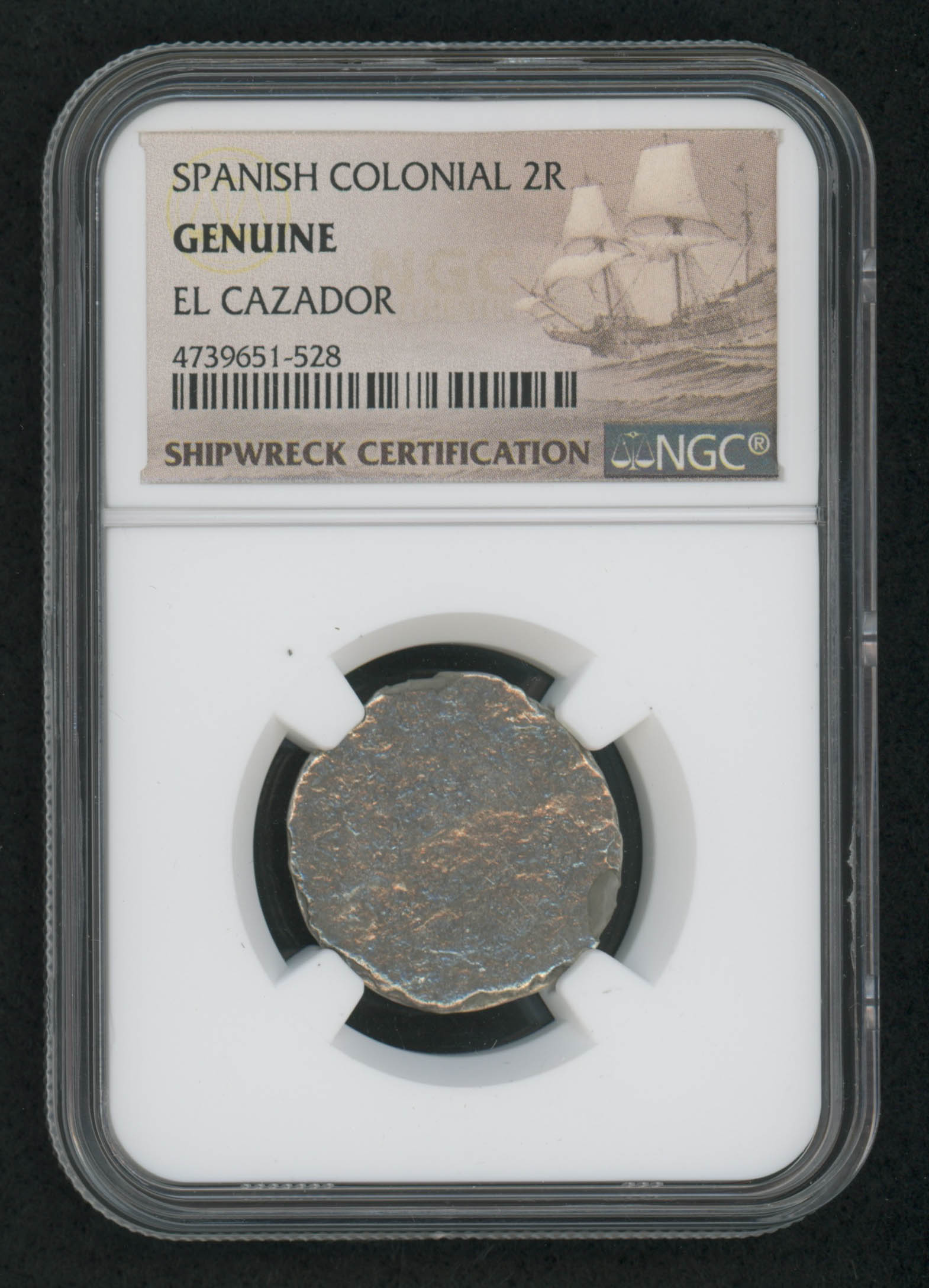 Spanish Colonial 2 Real Silver Shipwreck Coin from the El Cazador (NGC Encapsulated)
