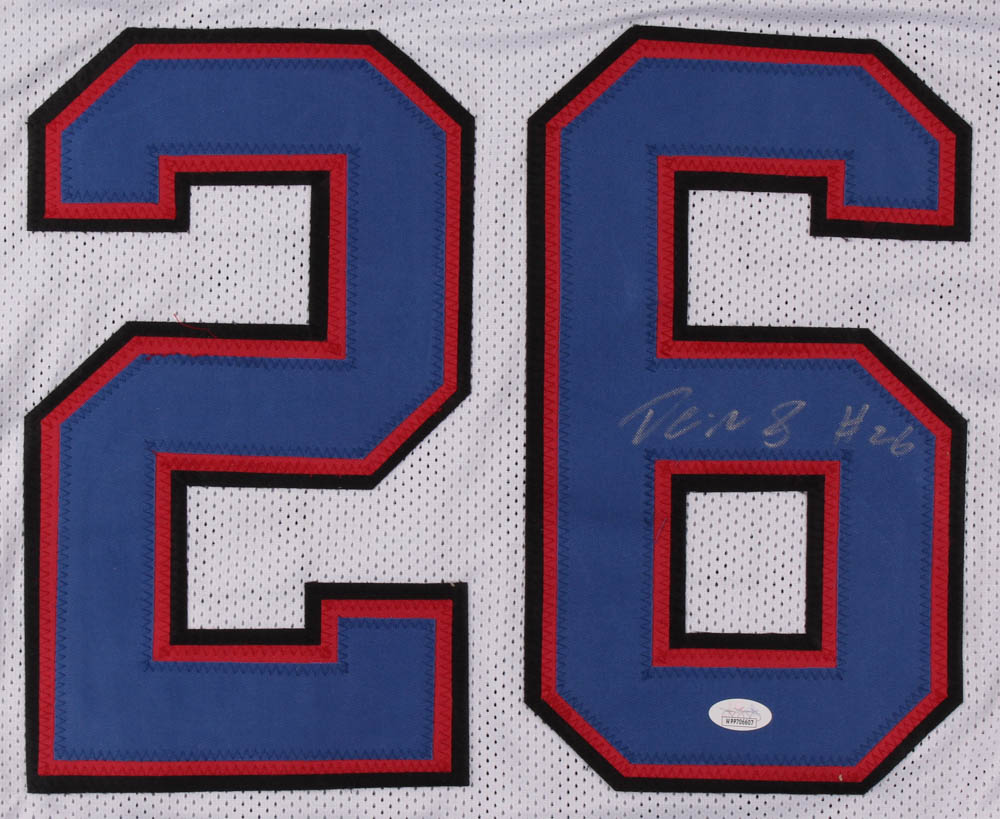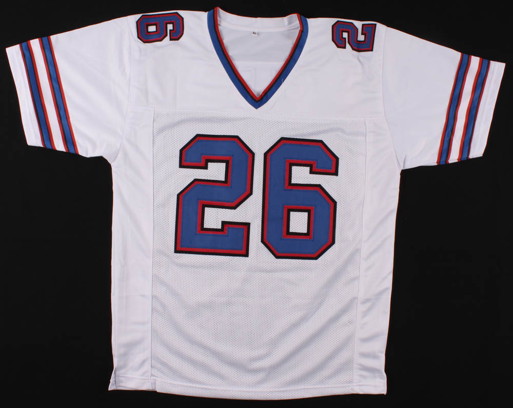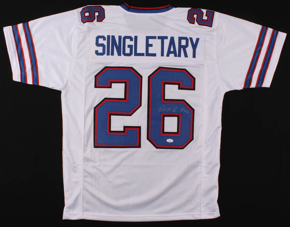 Custom on-field style jersey. Everything is sewn on, size XL. Hand-signed in silver paint pen by Devin Singletary.