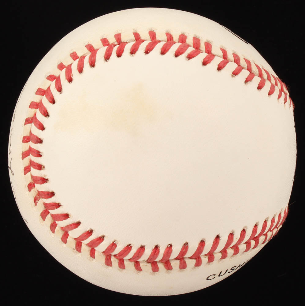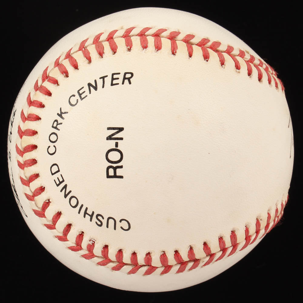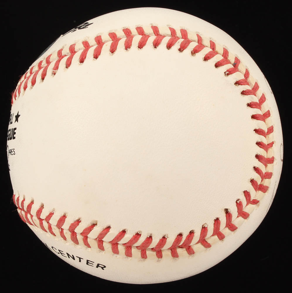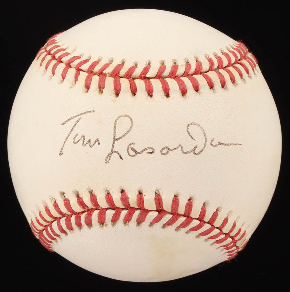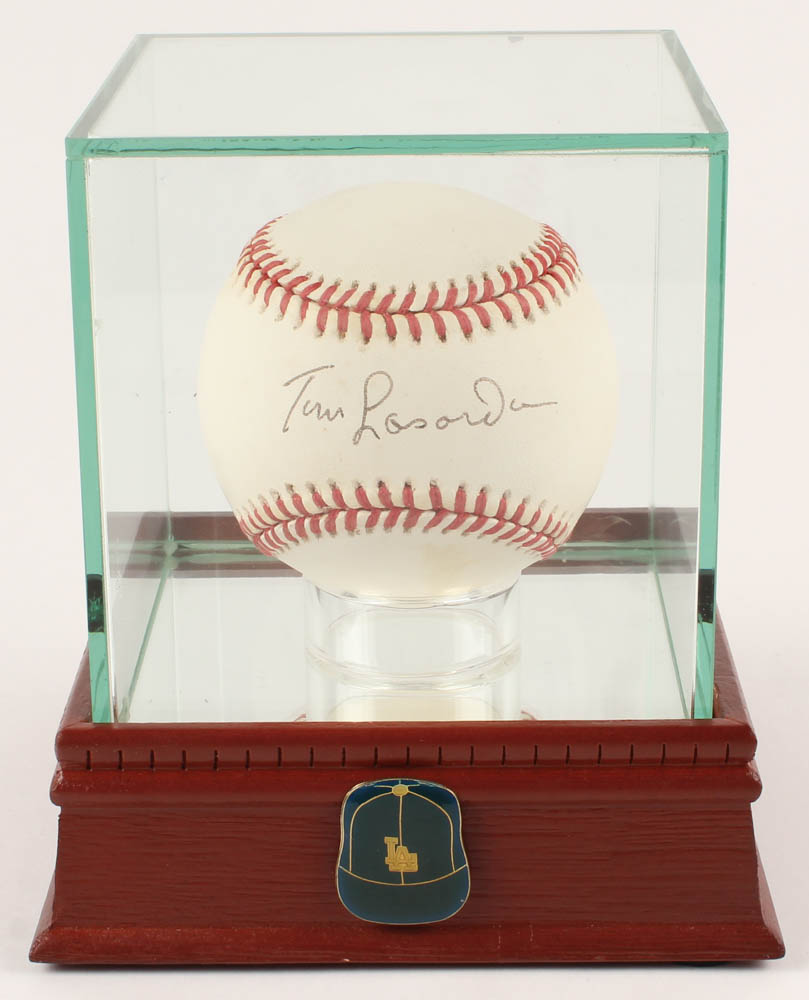 Official National League Baseball. Hand-signed in black ink pen by Tommy Lasorda (Los Angeles Dodgers, HOF). The auction also includes a display case with a wood base and glass cube and a vitnage 1970's Los Angeles Dodgers pin. Please note, the baseball shows signs of natural toning.