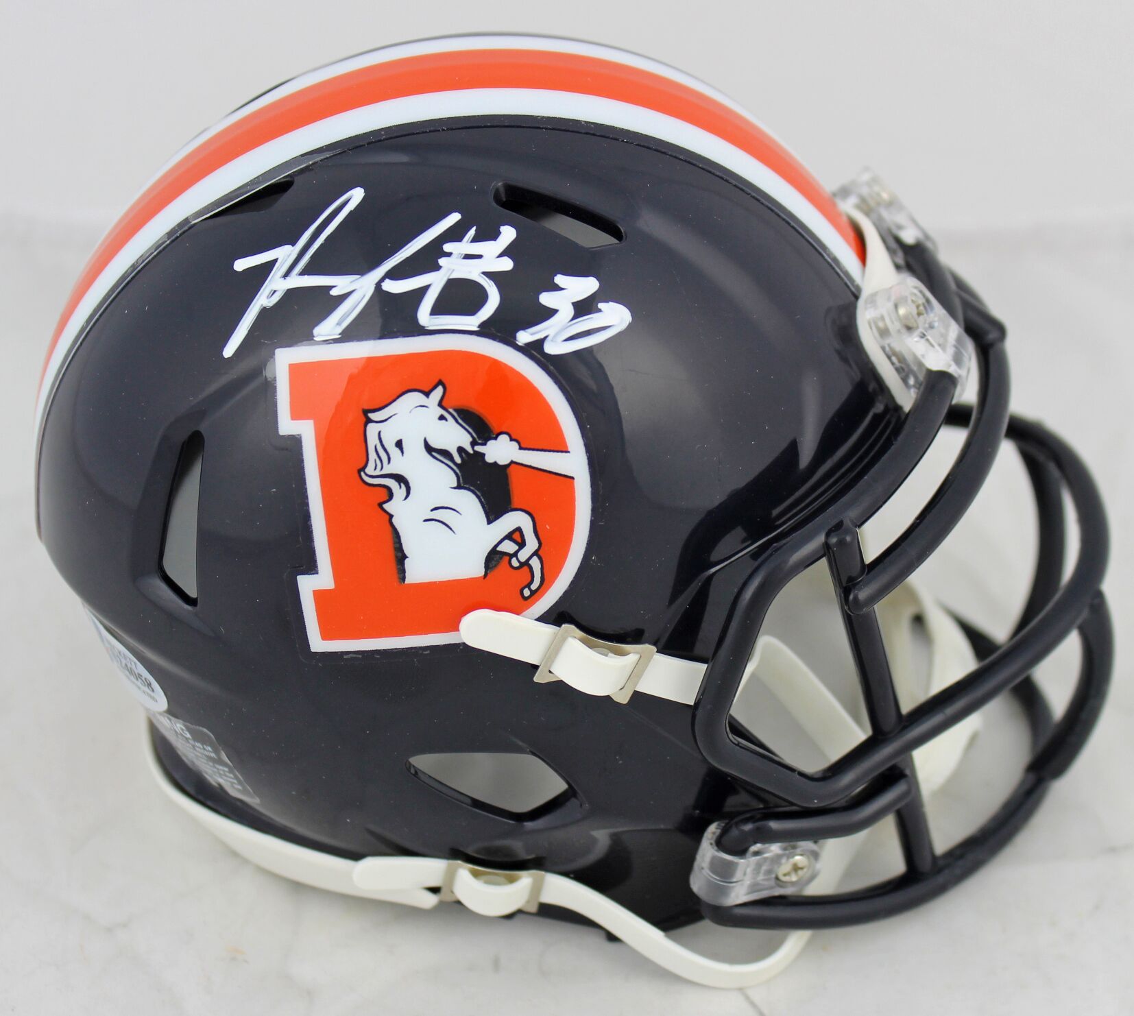 Riddell Denver Broncos color rush speed mini helmet. Hand-signed in white paint pen by Phillip Lindsay.