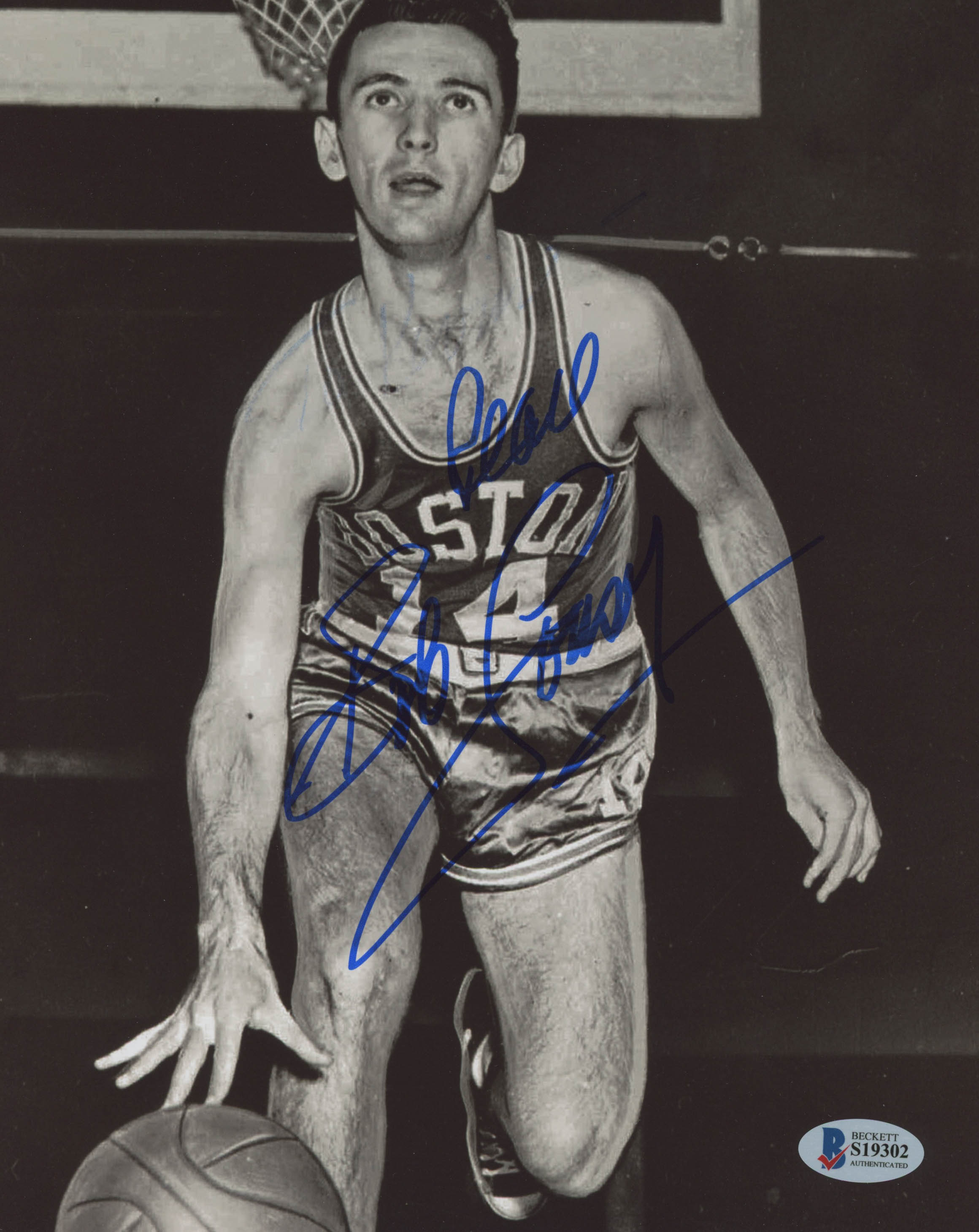 Photo measures 8" x 10" in size and has been hand-signed in blue felt-tip pen by Bob Cousy (Boston Celtics, HOF).