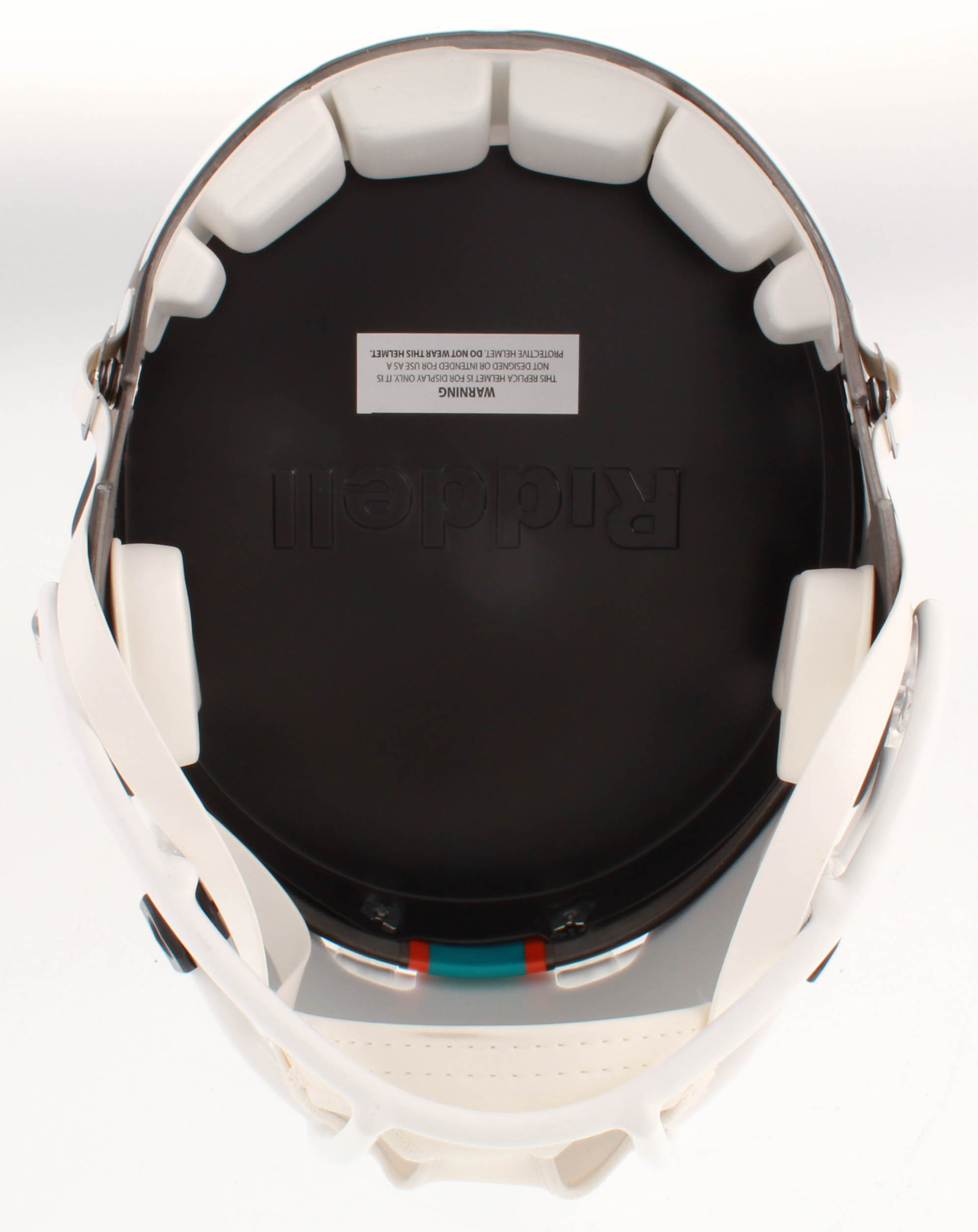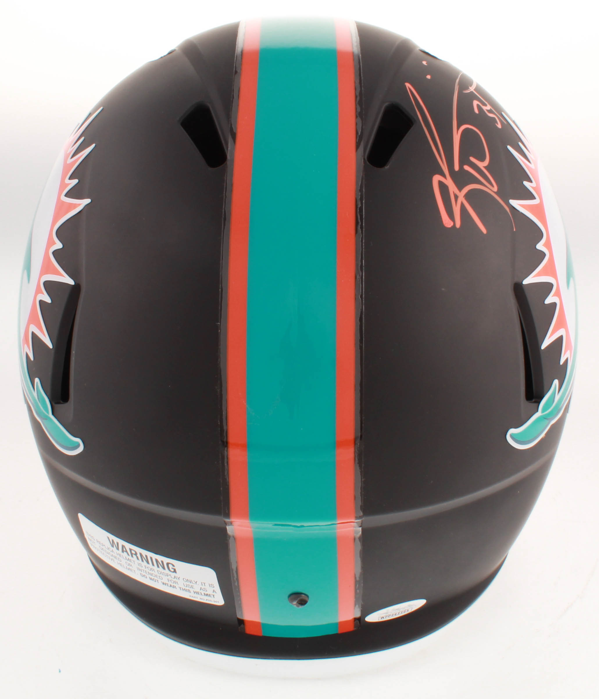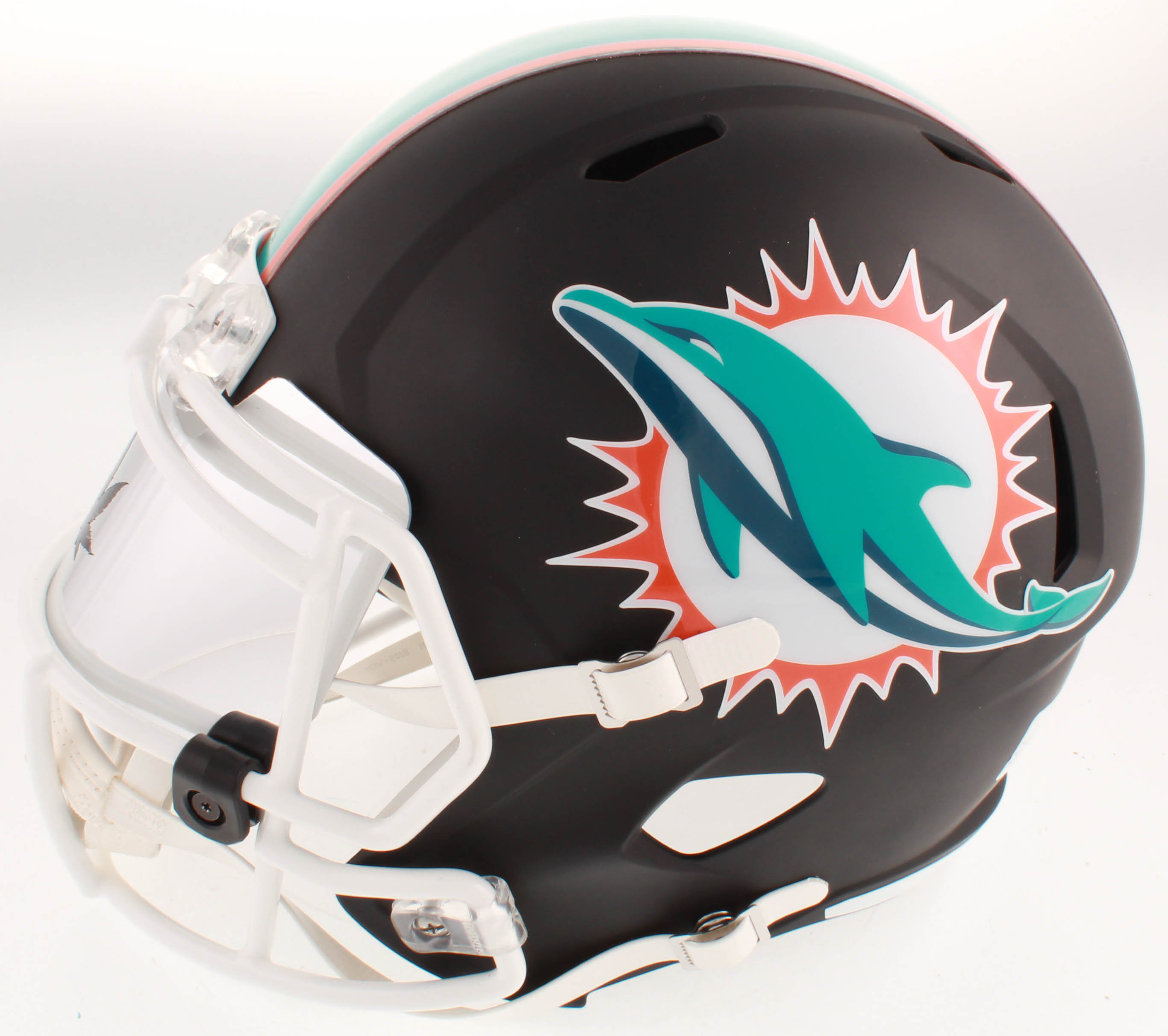 Riddell Miami Dolphins full-size matte black replica speed helmet. Hand-signed and inscribed in orange paint pen by Ricky Williams.