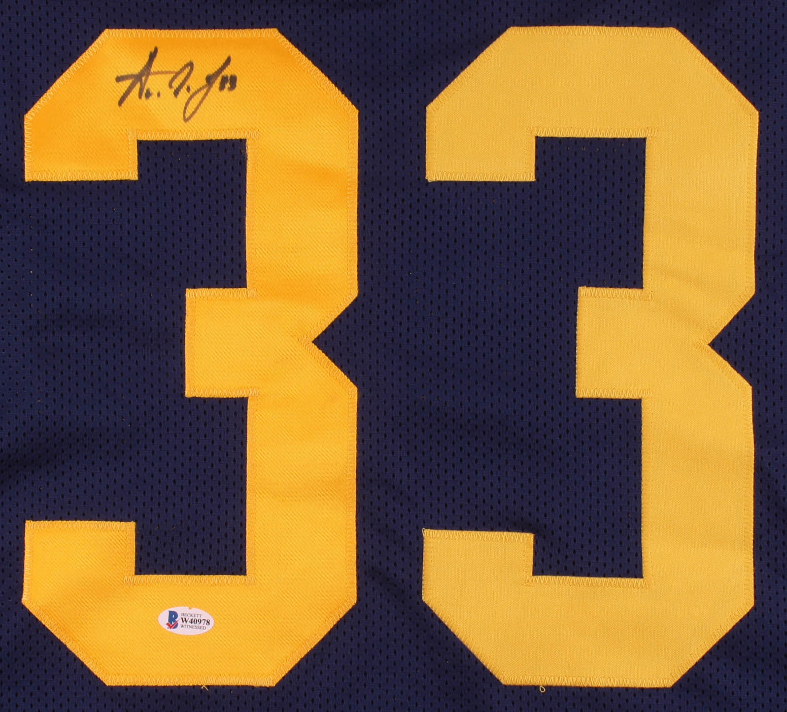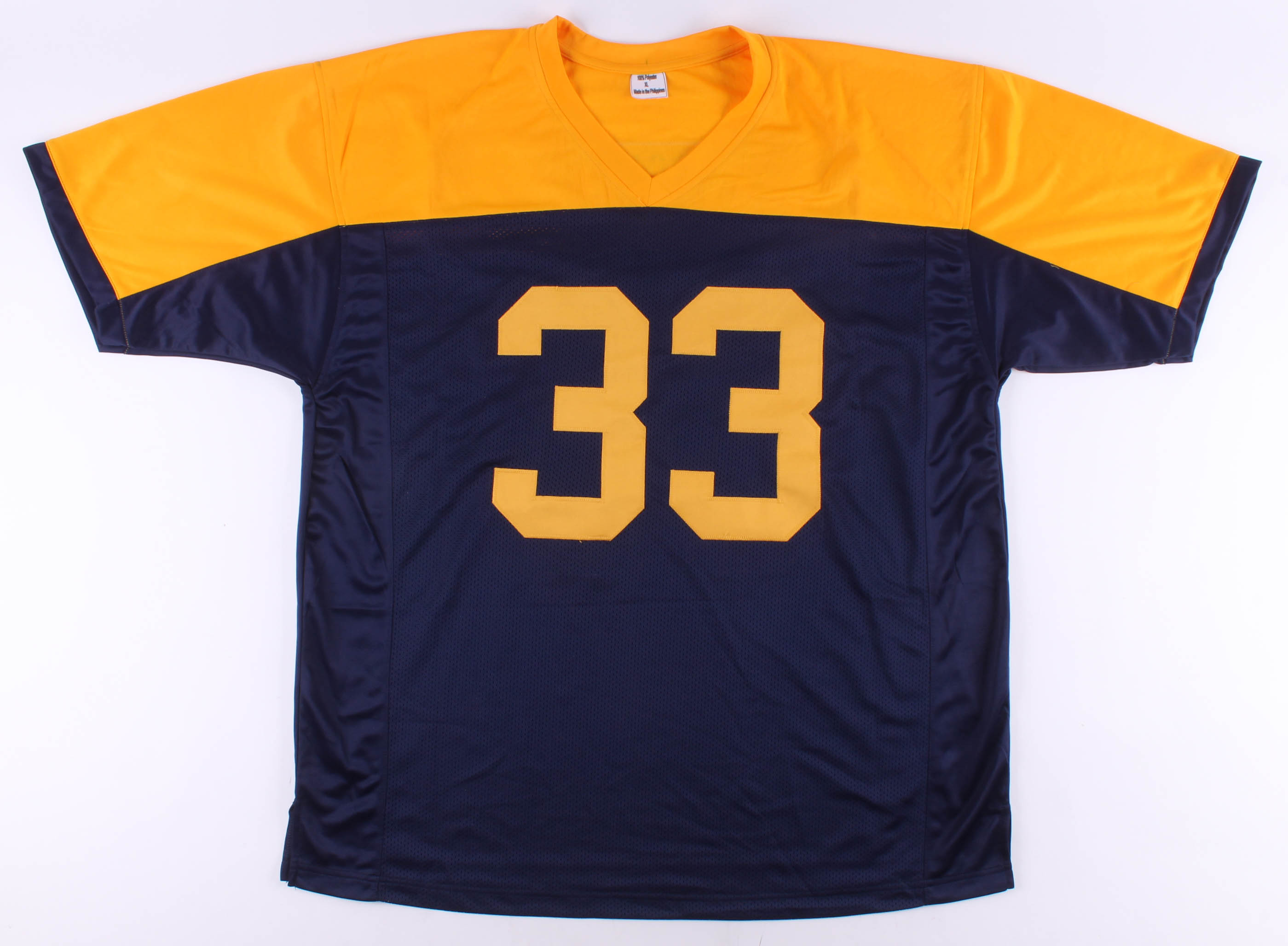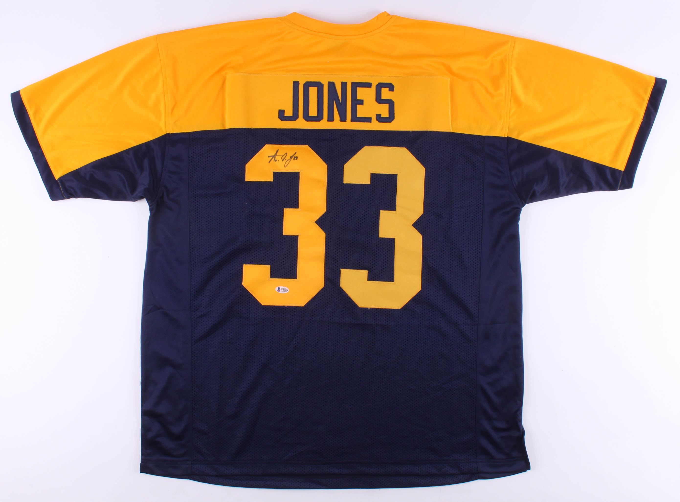 Custom on-field style jersey. Everything is sewn on, size XL. Hand-signed in black felt-tip pen by Aaron Jones.