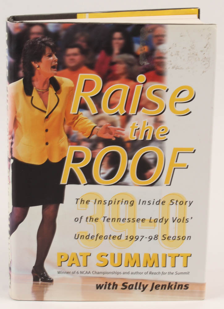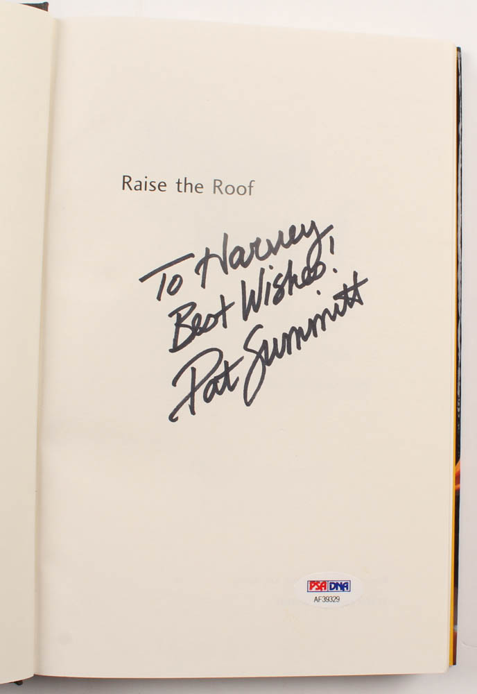 "Raise The Roof" hardcover book has been hand-signed on the inside cover page in black felt tip pen by Pat Summitt (D. 2016, HOF). Please note, inscription has been personalized "To Harvey".