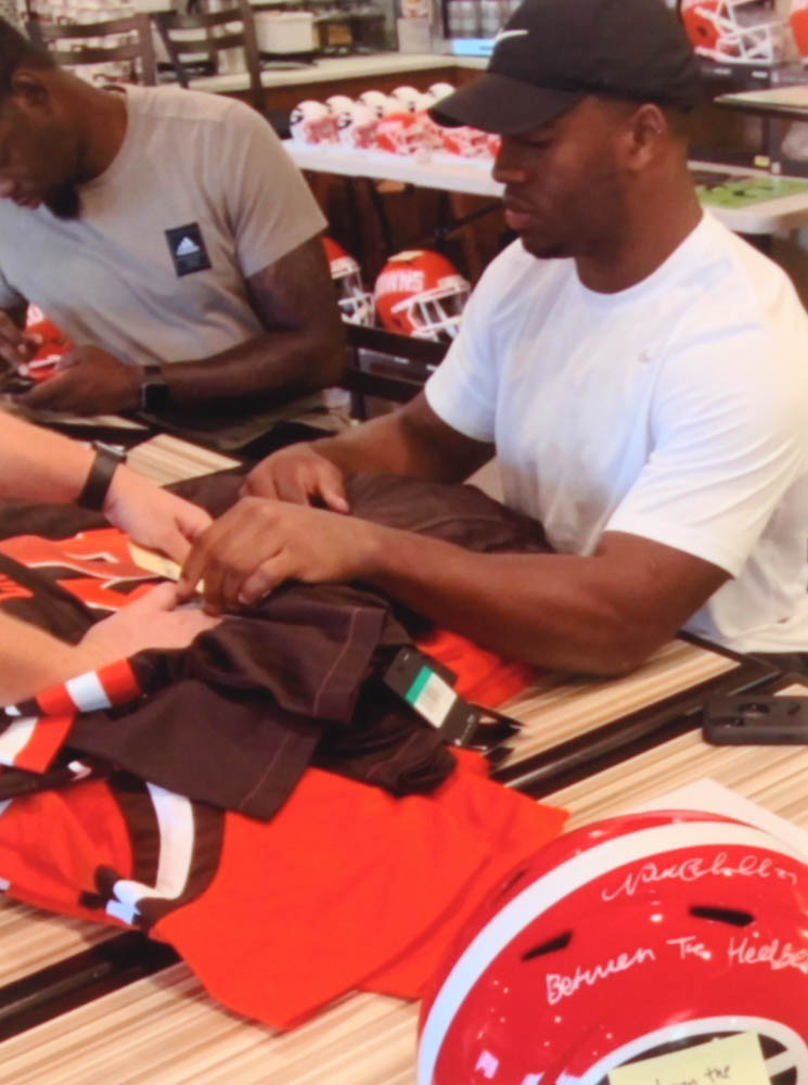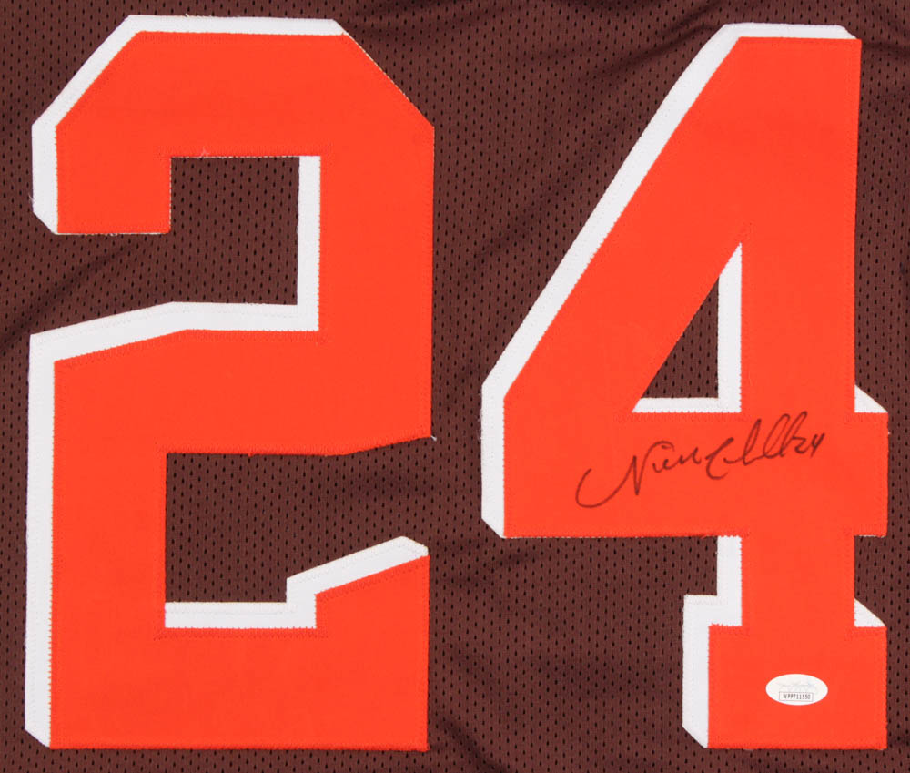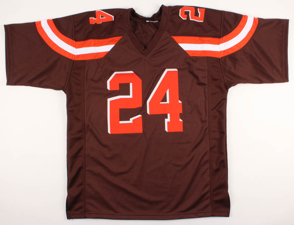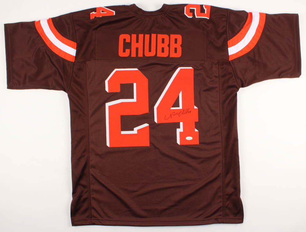Custom on field style jersey with everything sewn on, size XL. Jersey has been hand-signed in black felt-tip pen by Nick Chubb.