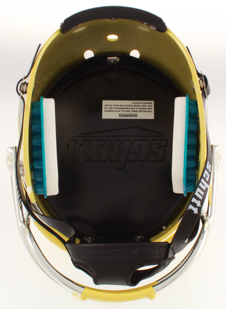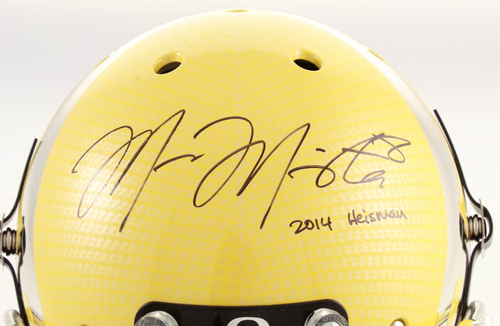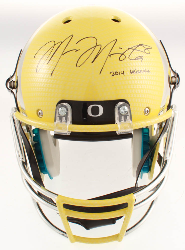 Schutt Oregon Ducks full-size replica helmet. Hand-signed and inscribed in black felt-tip pen by Marcus Mariota.