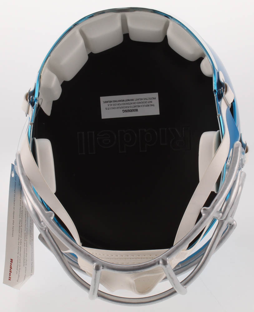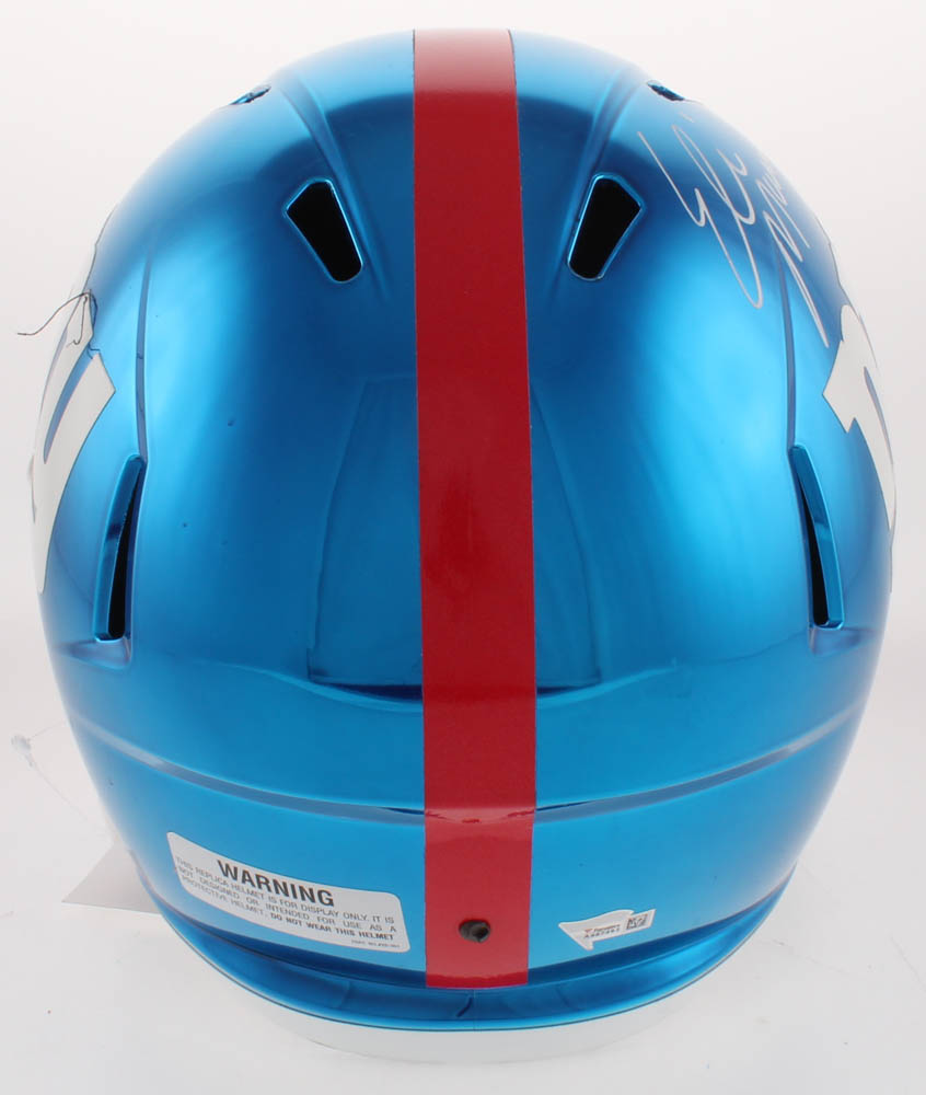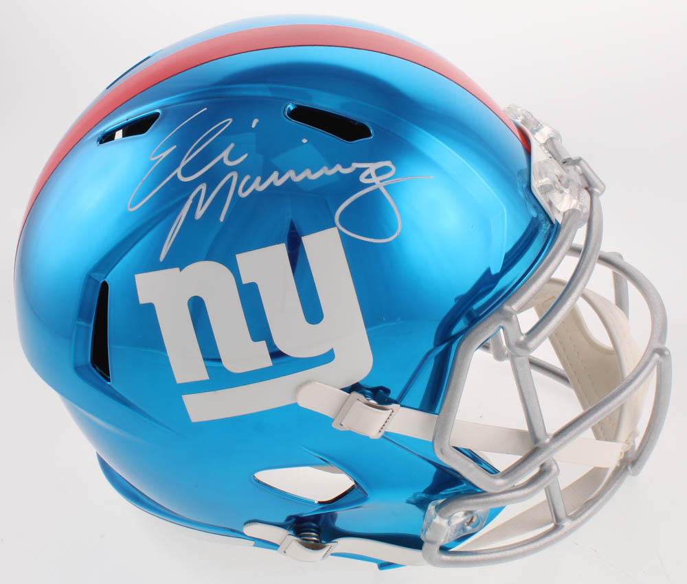 Riddell New York Giants full-size replica chrome speed helmet. Hand-signed in white paint pen by Eli Manning (New York Giants).