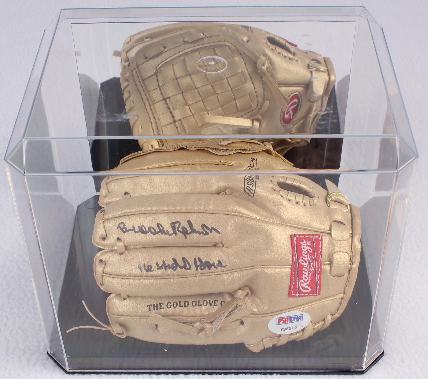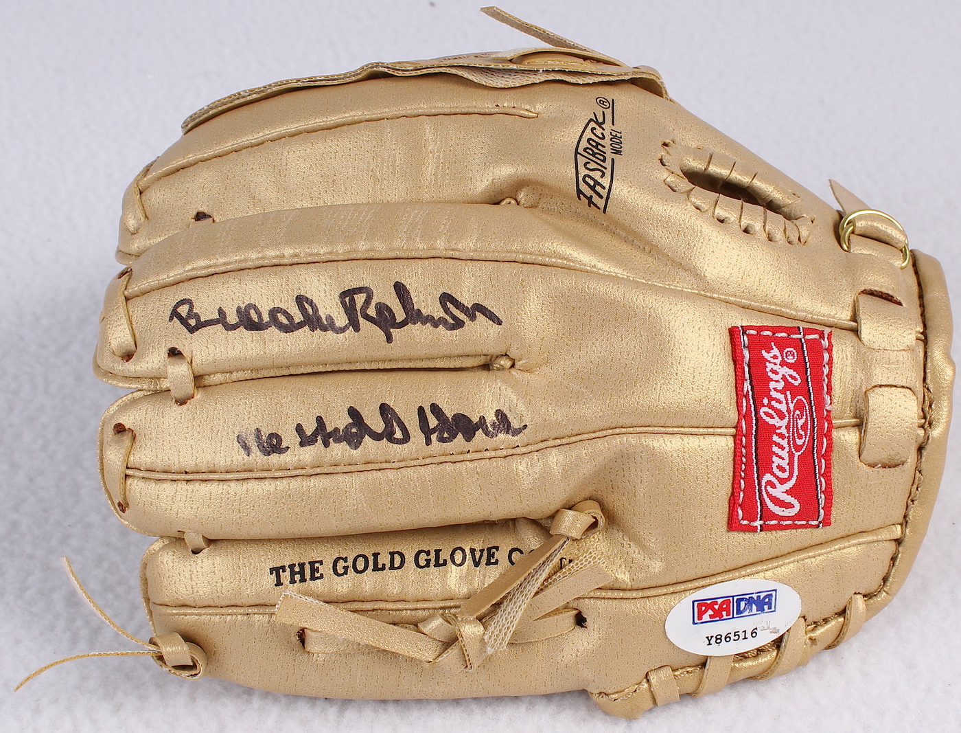 Rawlings "The Gold Glove Co." mini baseball glove. The glove measures roughly 6" long. Hand-signed and inscribed in black felt tip pen by Brooks Robinson (Orioles HOF). The glove comes with the display case shown in the photos. Autograph includes an official PSA/DNA hologram and matching COA for authenticity purposes.