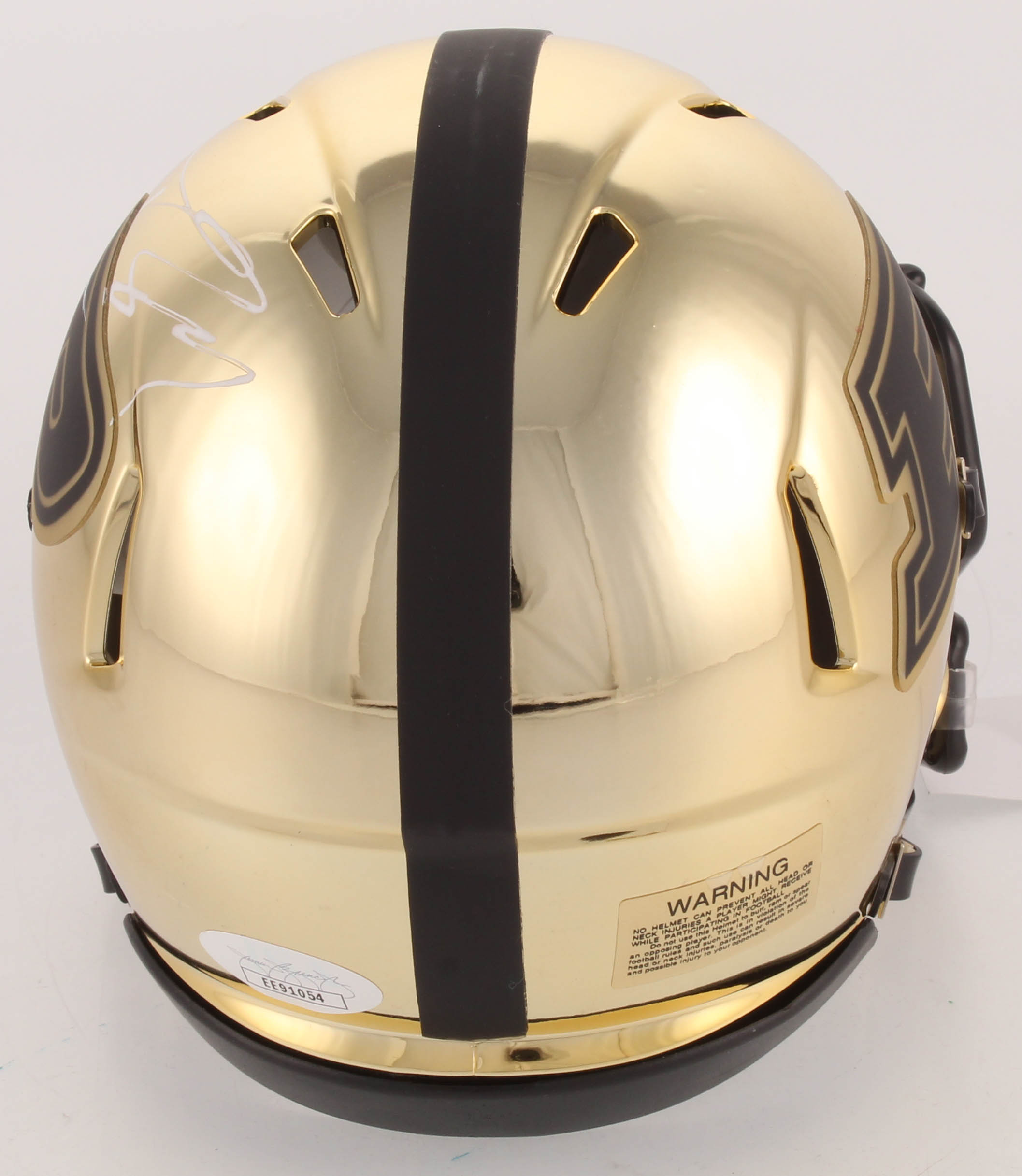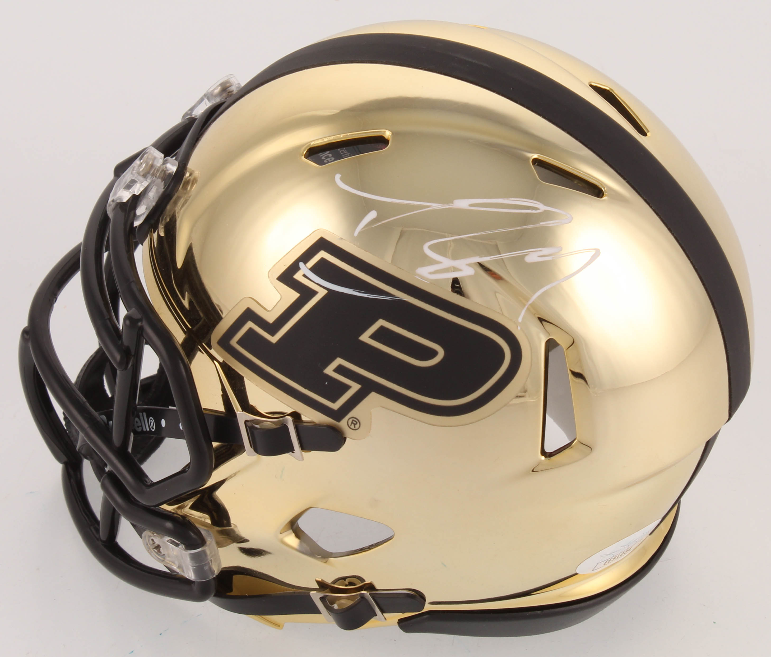 Riddell Purdue Boilermakers Chrome Speed mini helmet. Has been hand-signed in white paint pen by Drew Brees.