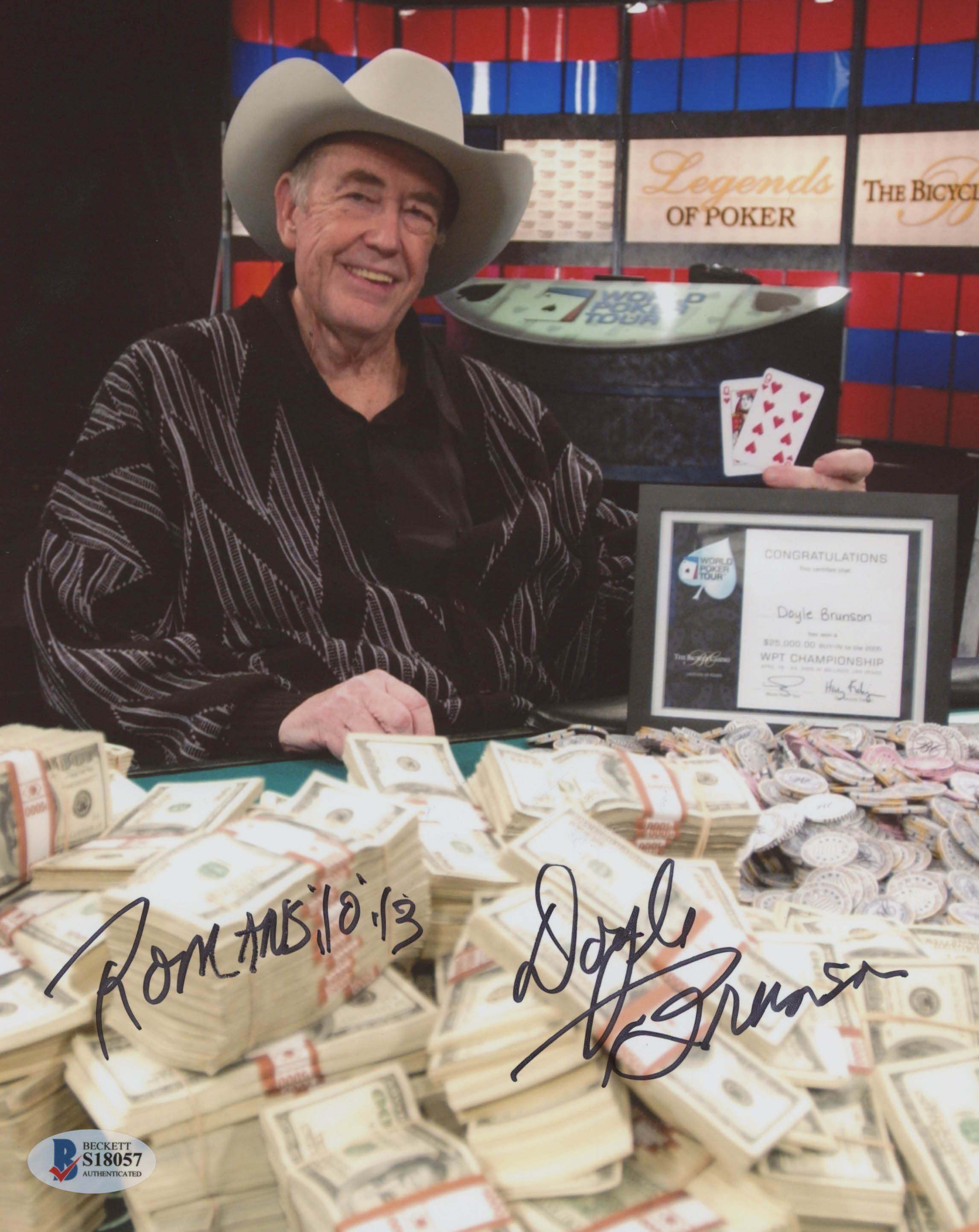 Photo measures 8" x 10" in size and has been hand-signed in black felt-tip pen by Doyle Brunson. Please note, a personalization has been removed.