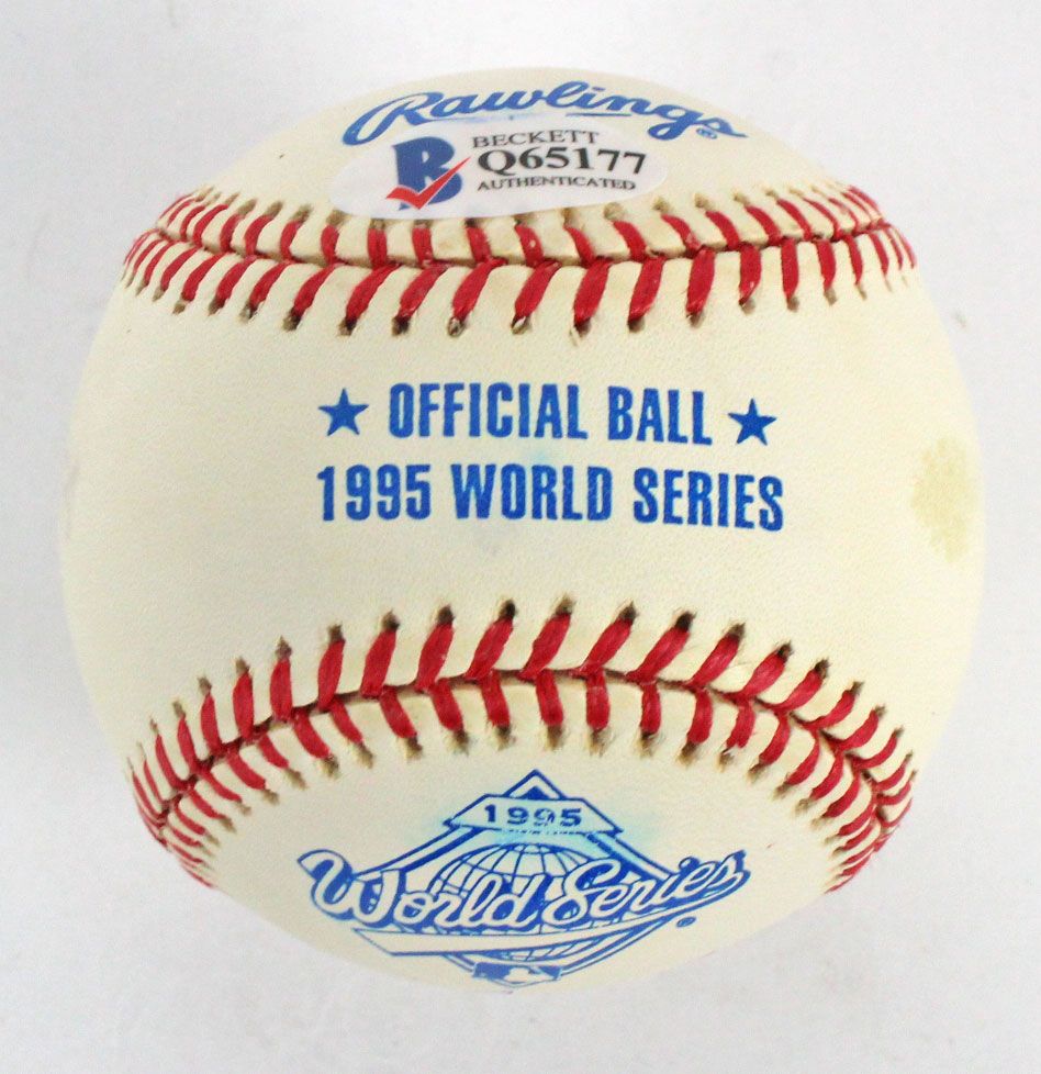Rawlings Official 1995 World Series Baseball. Hand-signed and inscribed in blue ink pen by Chipper Jones (Atlanta Braves, HOF).