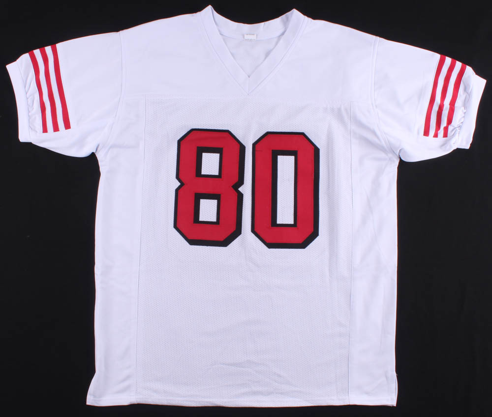 Custom on-field style jersey. Everything sewn on, size XL. Hand-signed in black felt-tip pen by Jerry Rice (HOF).