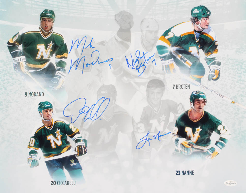 Photo measures 16" x 20" in size and has been hand-signed in blue felt-tip pen by (4) Hall of Fame Minnesota North Stars, with Mike Modano, Neal Broten, Dino Ciccarelli, and Lou Nanne.
