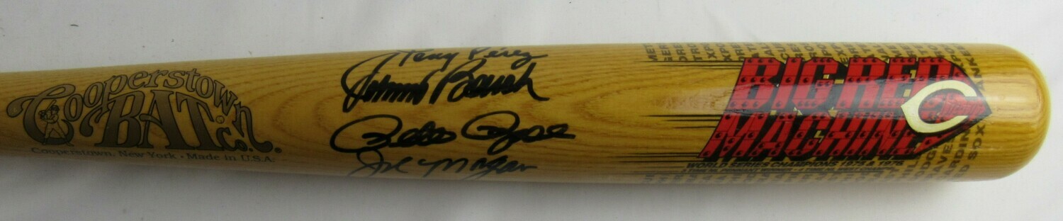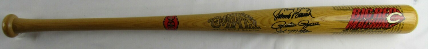 Cooperstown Cincinnati Reds "Big Red Machine" Baseball Bat. Hand-signed in black felt-tip pen by Johnny Bench (HOF), Joe Morgan (HOF), Tony Perez (HOF), and Pete Rose.