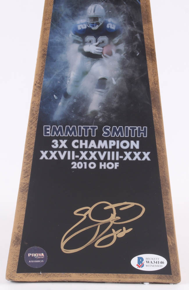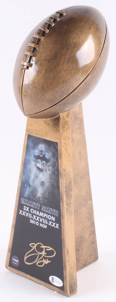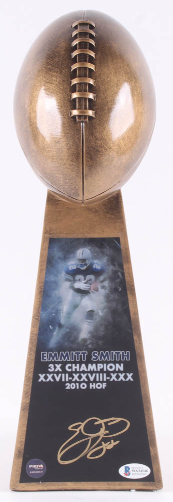 Trophy measures approximately 15" in height. Hand-signed by Emmitt Smith (Dallas Cowboys, HOF).