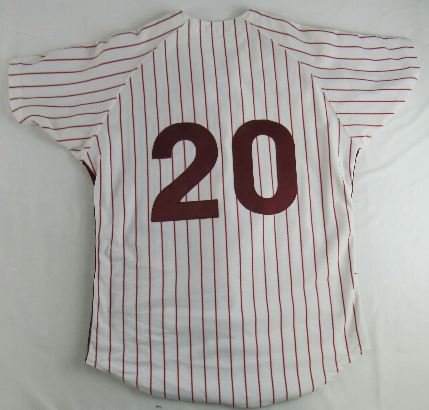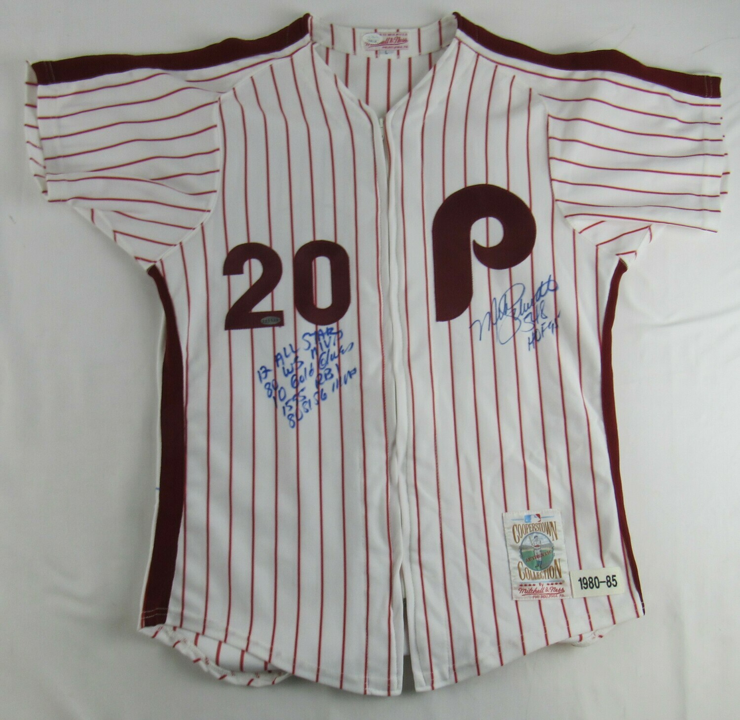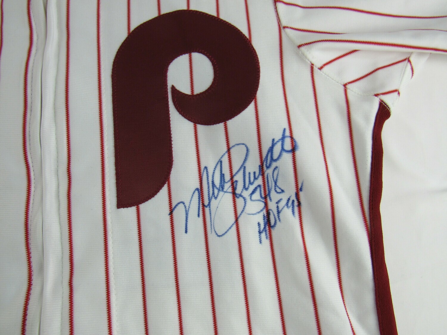Mitchell & Ness on-field style jersey. Everything sewn on, size L. Hand-signed and inscribed in blue felt-tip pen by Mike Schmidt (HOF).