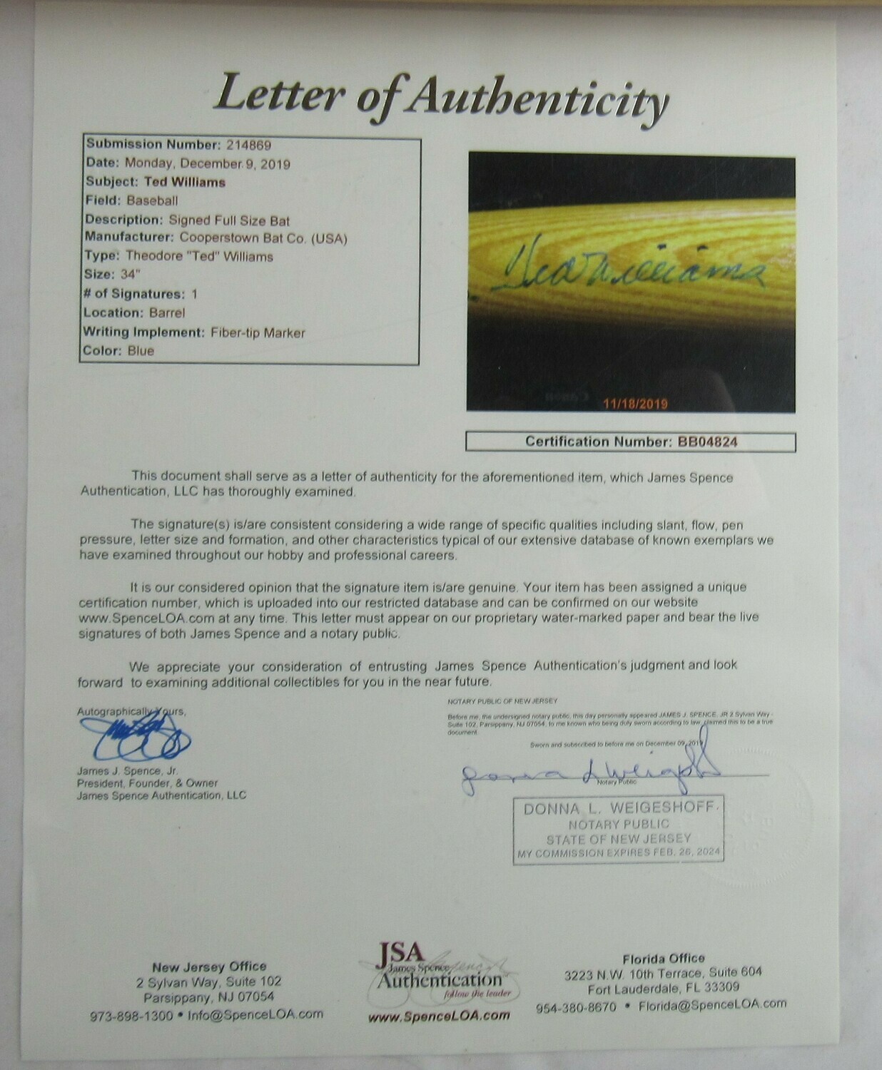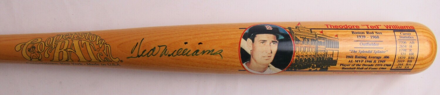Ted Williams Signed Cooperstown Williams Commemorative Baseball Bat (JSA LOA)