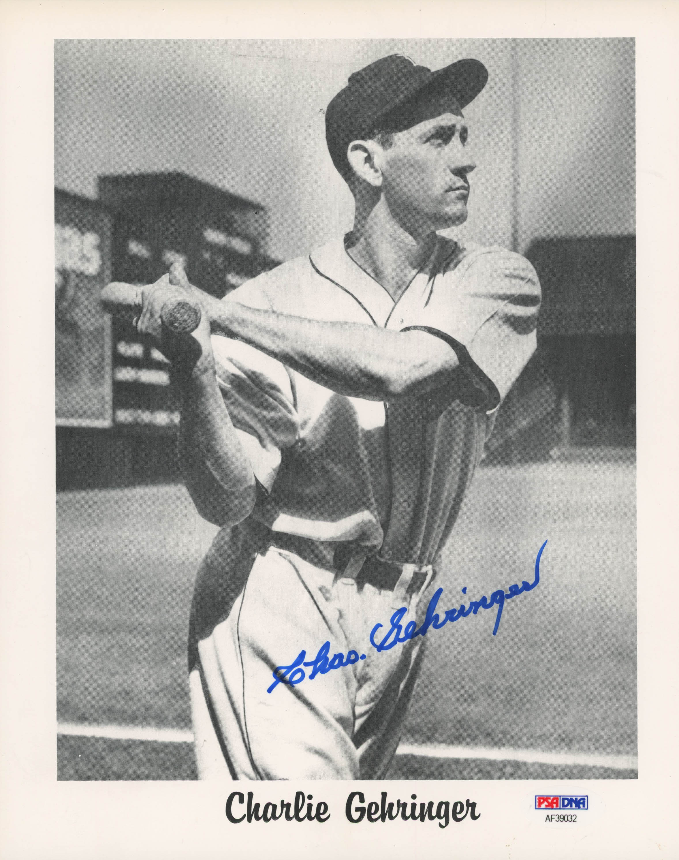 Photo measures 8" x 10" in size and is hand-signed in blue felt-tip pen by Charlie Gehringer (D. 1993, Detroit Tigers, HOF).