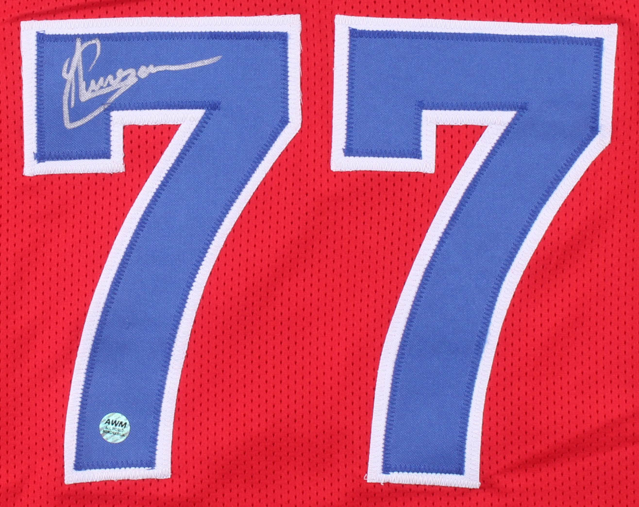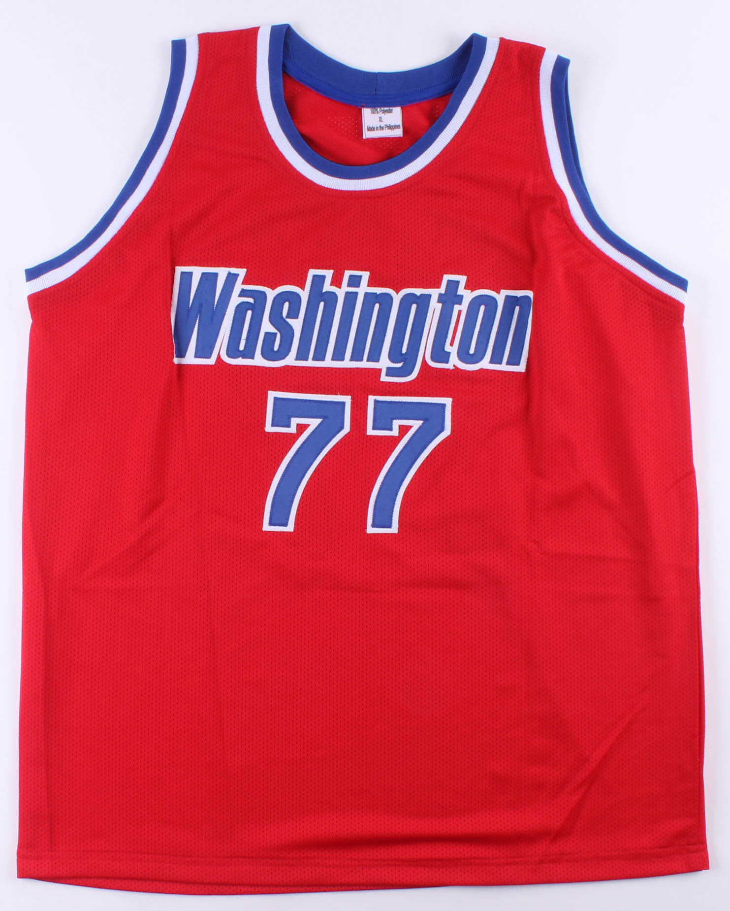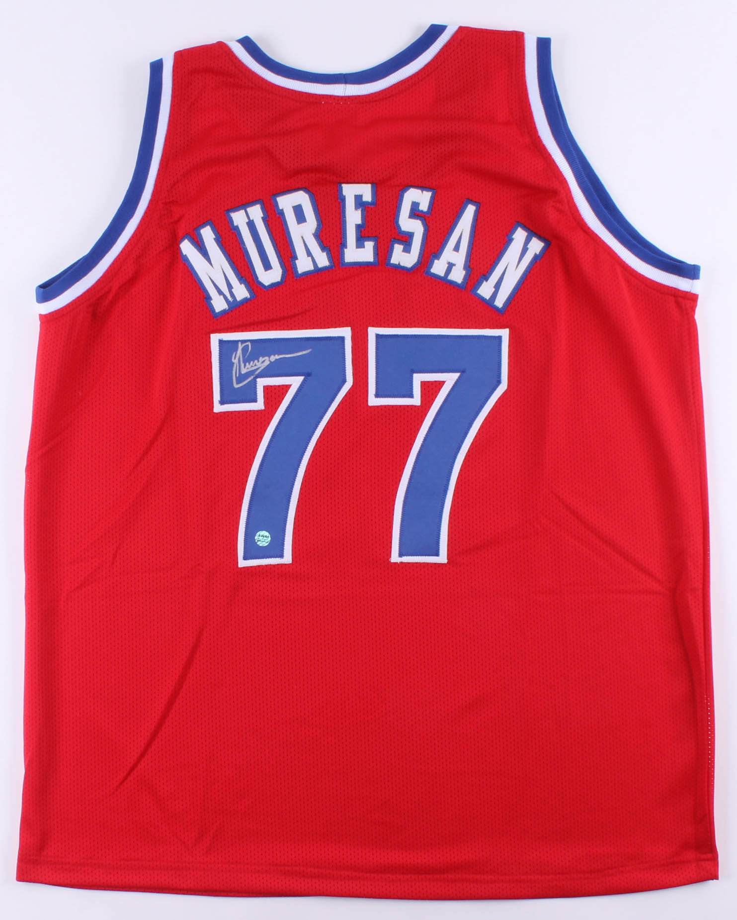 Custom on-court style jersey. Everything is sewn on, size XL. Hand-signed and inscribed in silver paint pen by Gheorghe Muresan.