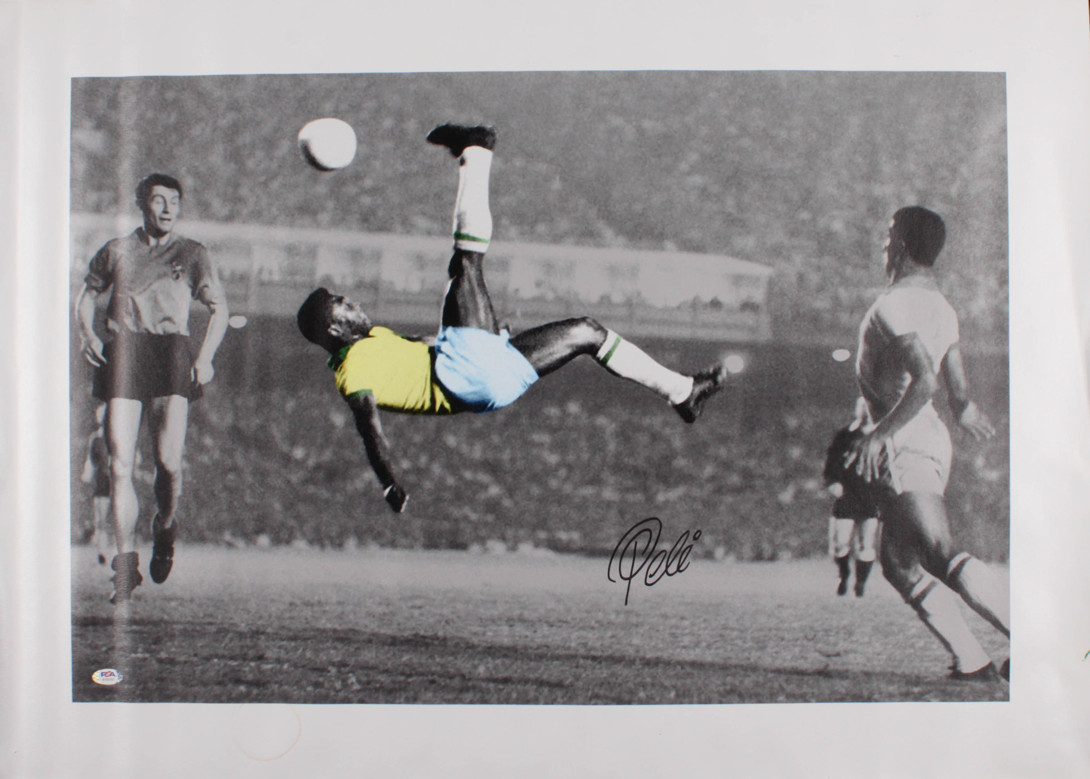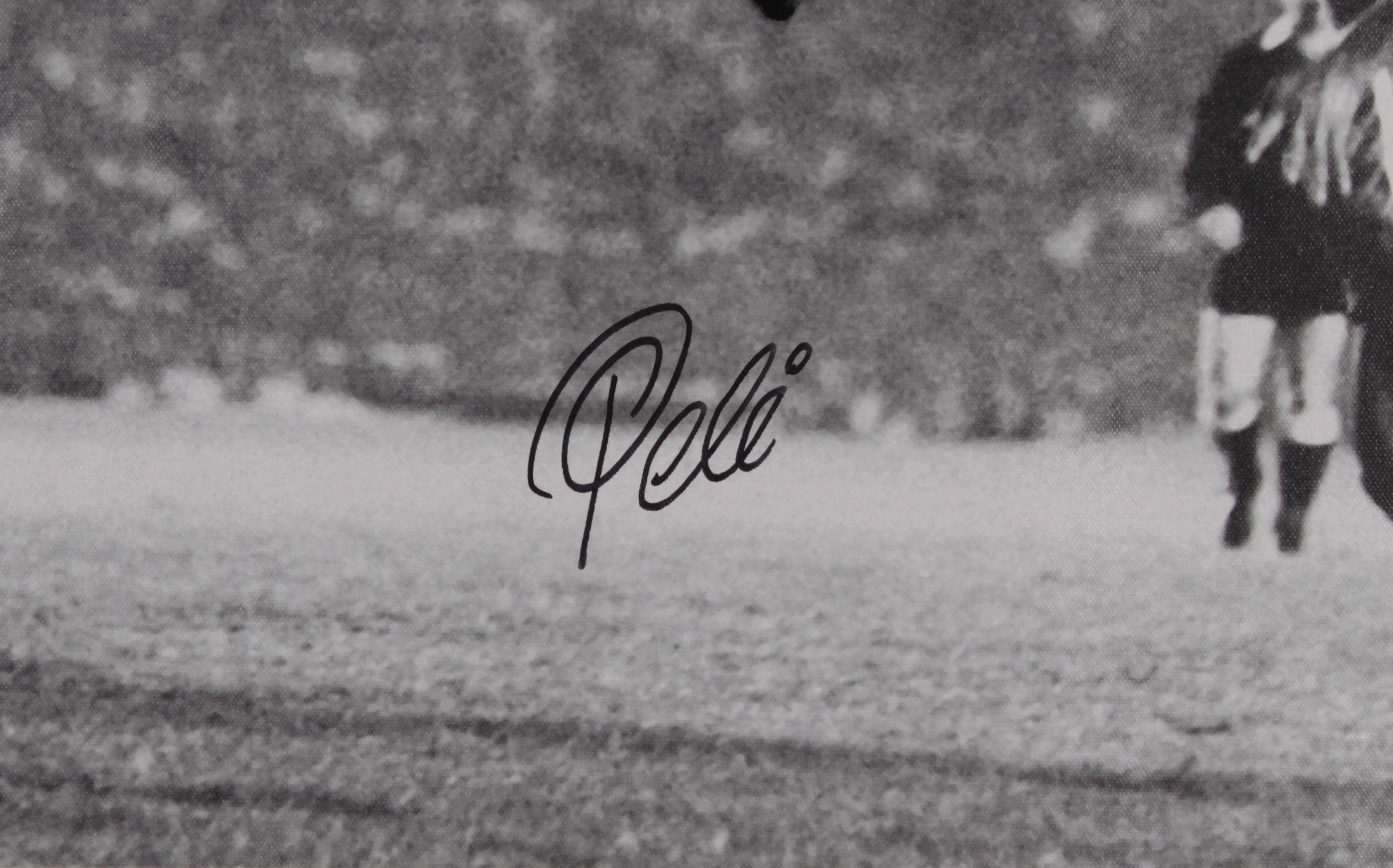 Print on canvas measures 25.5" x 35.25" in size and has been hand-signed in black felt-tip pen by Pele (HOF). Please note the condition of the canvas.