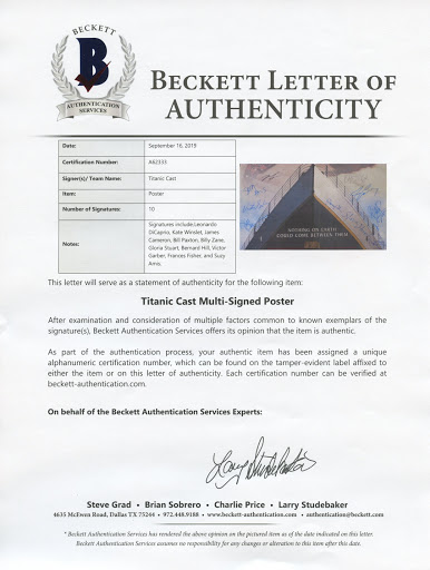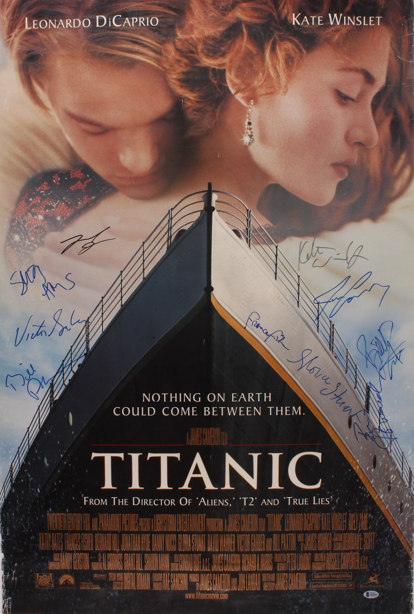 Movie poster photo measures 27" x 40" in size and has been hand-signed in black and blue felt-tip pen by Leonardo DeCaprio, Kate Winslet, James Cameron, Bill Paxton, Billy Zane, Gloria Stuart, Bernard Hill, Victor Garber, Frances Fisher, and Suzy Amis.