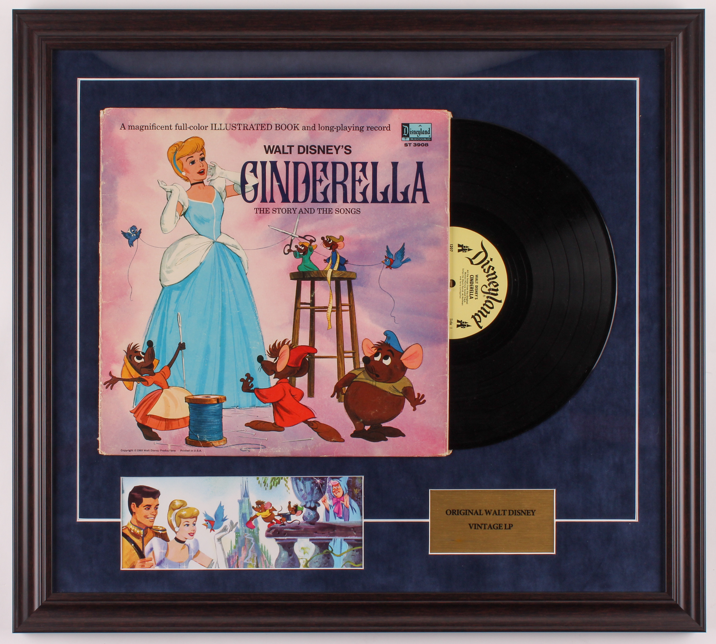 Custom frame measures 22" x 24.5" in size and features a vinyl record from the Walt Disney's "Cinderella" (1956). Please note, the frame includes the album and the vinyl record.