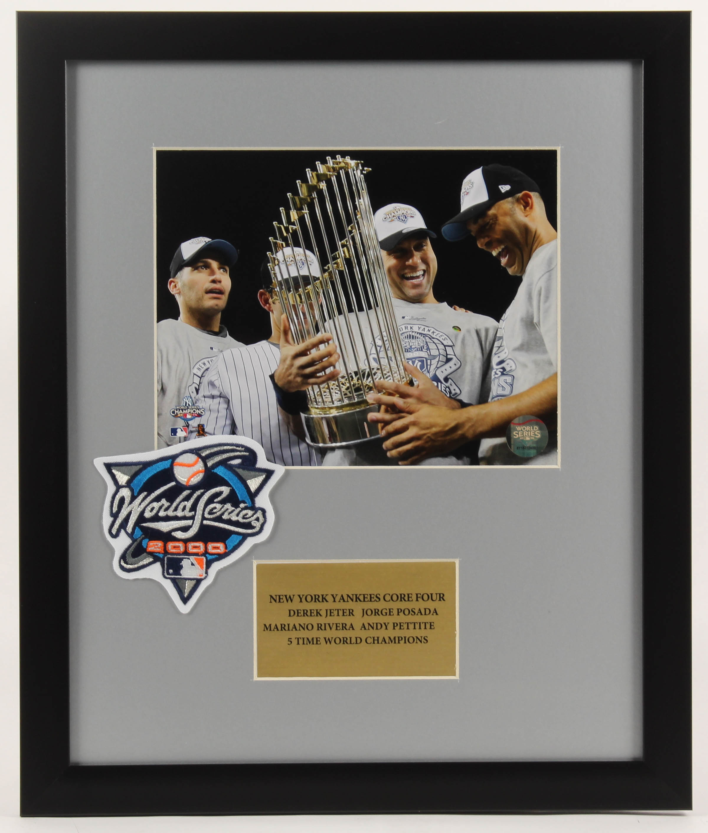 Custom frame measures 16" x 19" in size and features a photo of the Yankees "Core Four" with Mariano Rivera, Derek Jeter, Jorge Posada and Andy Pettitte. Display also features a Yankees patch.
