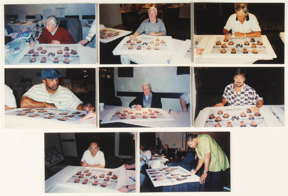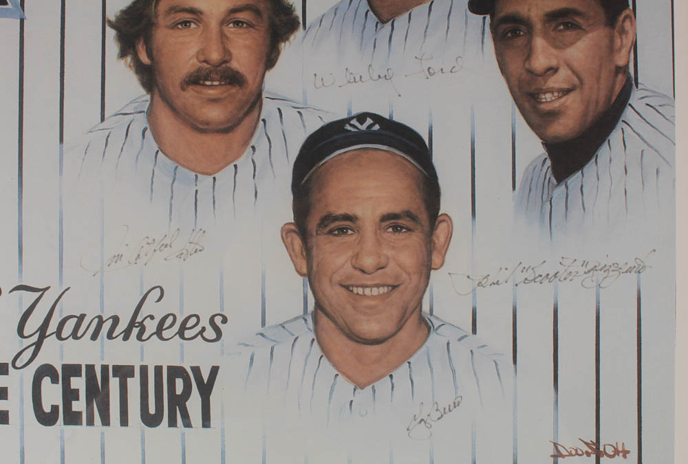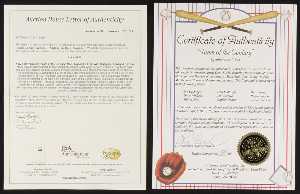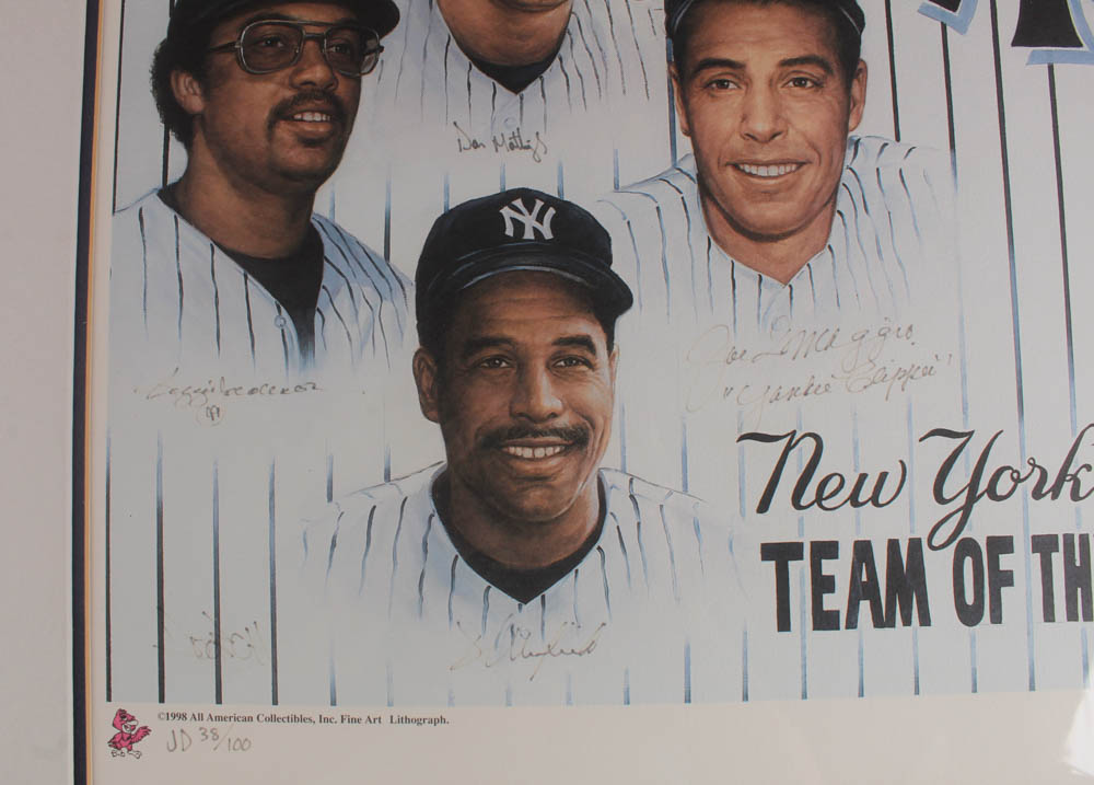 Custom frame measures 33.5" x 39.5" in size and features a lithograph that has been hand-signed and inscribed in black felt-tip pen by (8) with Reggie Jackson (HOF), Phil Rizzuto (D. 2007, HOF), Dave Winfield (HOF), Yogi Berra (D. 2015, HOF), Joe DiMaggio (D. 1999, HOF), Jim "Catfish" Hunter (D. 1999, HOF), Don Mattingly and Whitey Ford (HOF). Hand-numbered limited edition #38/100. Please note, the frame shows signs of minor handling.