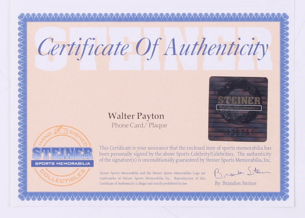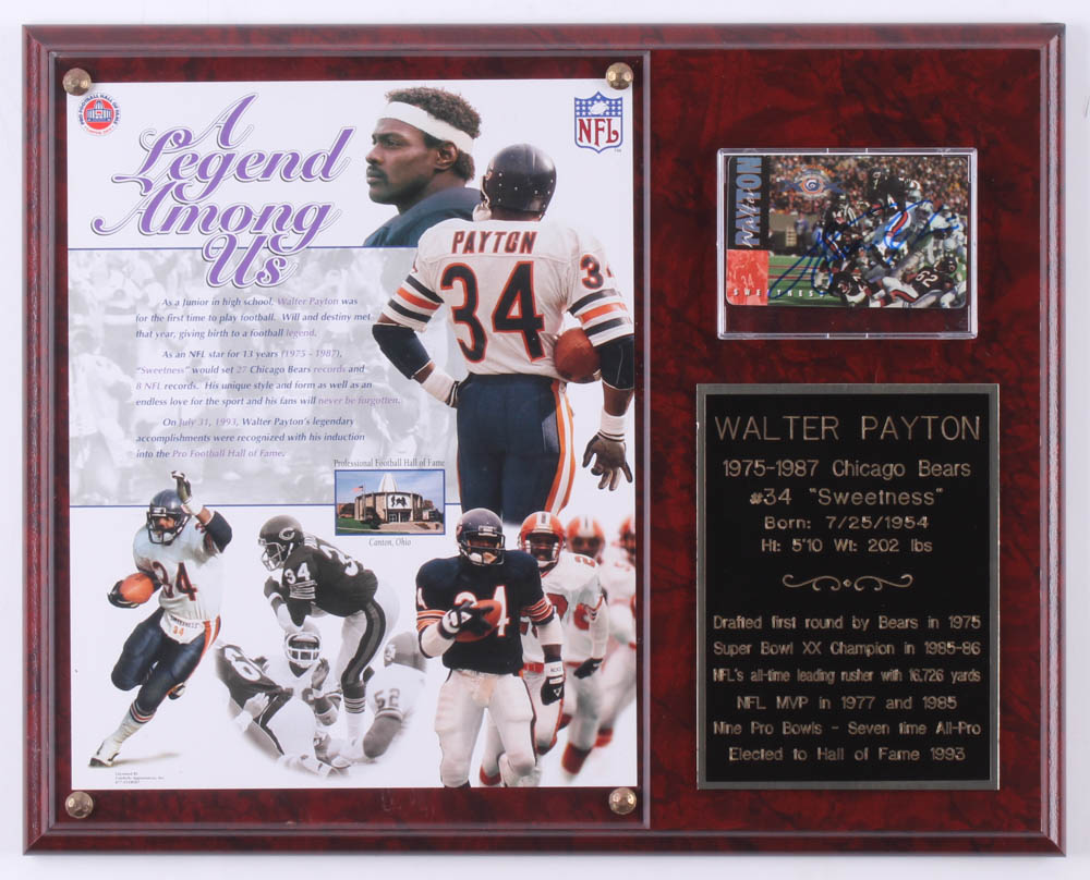 Plaque Display measures 12" x 15" in size. Featuring a football card hand-signed in blue felt-tip pen by Walter Payton (D. 1999, Chicago Bears, HOF). It also features a Walter Payton photo and has his career highlights engraved. Please see the photos for more details.