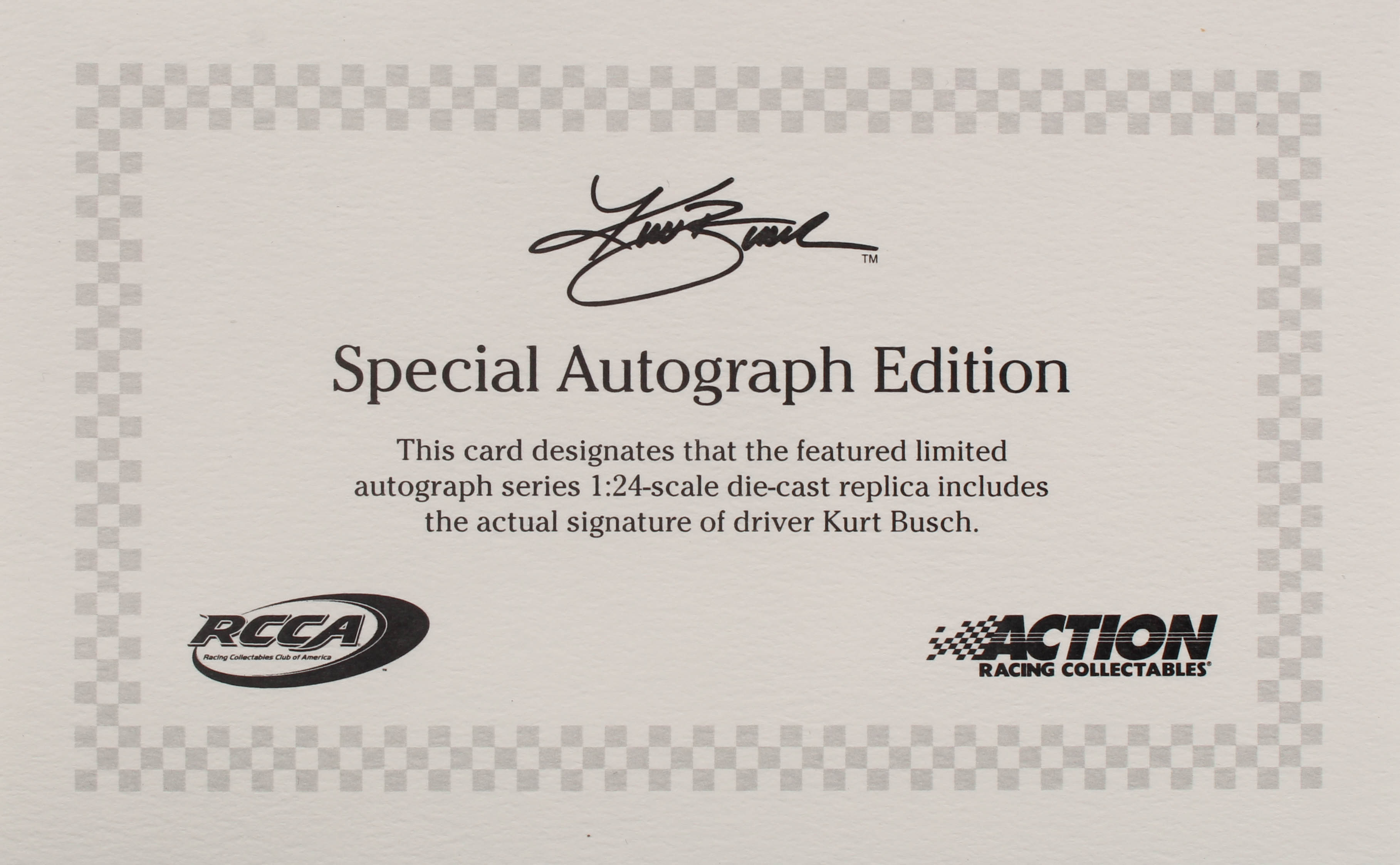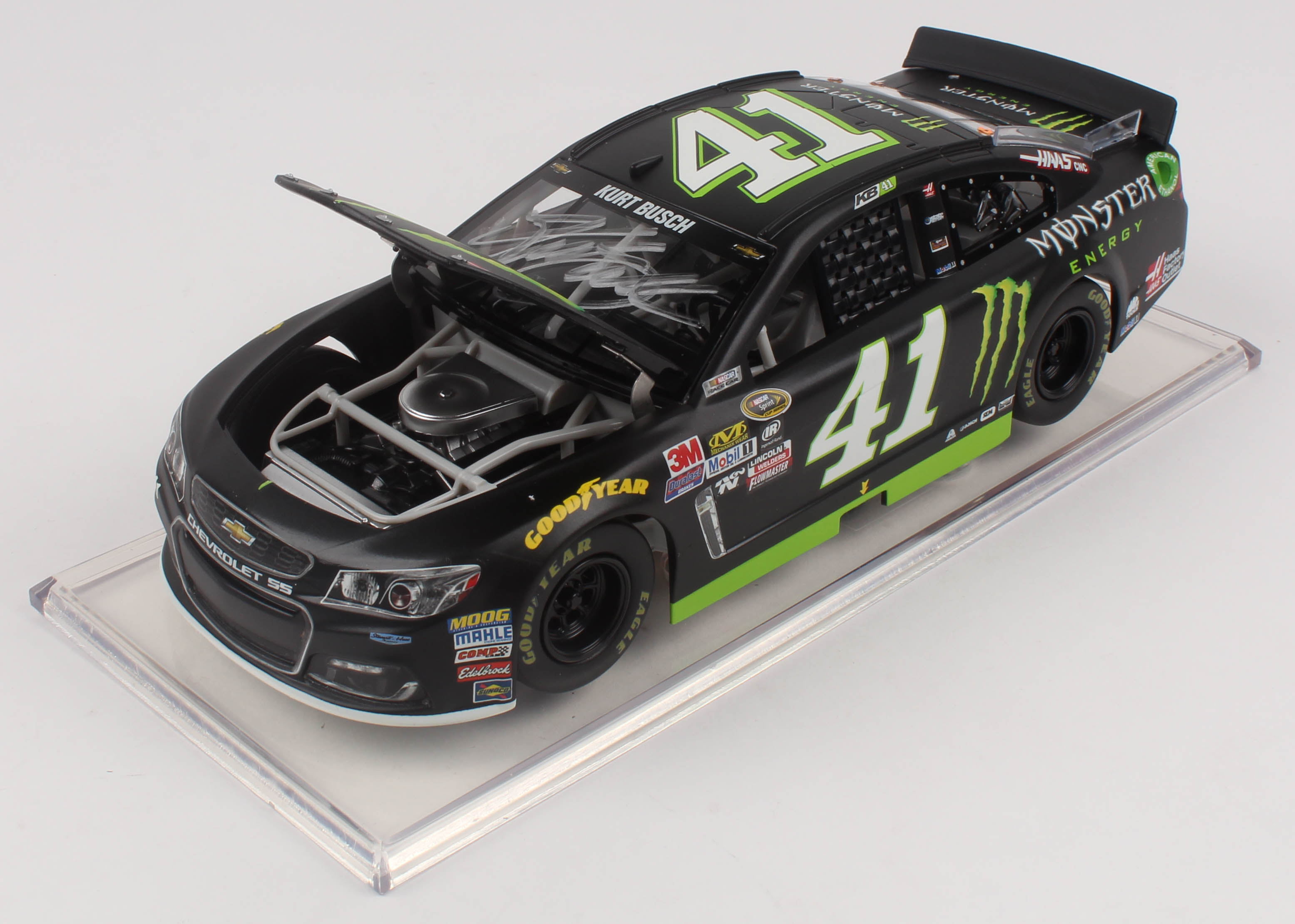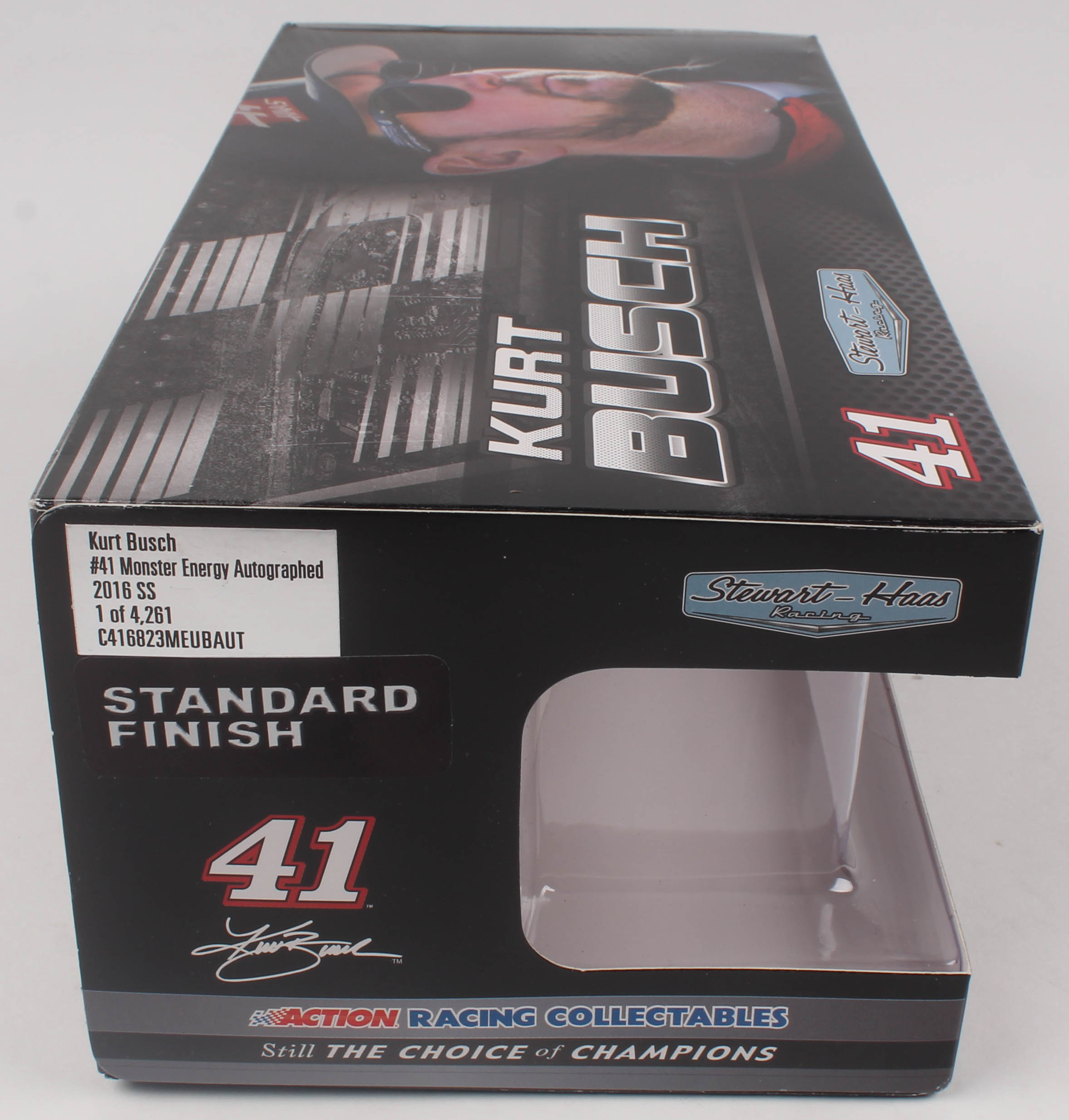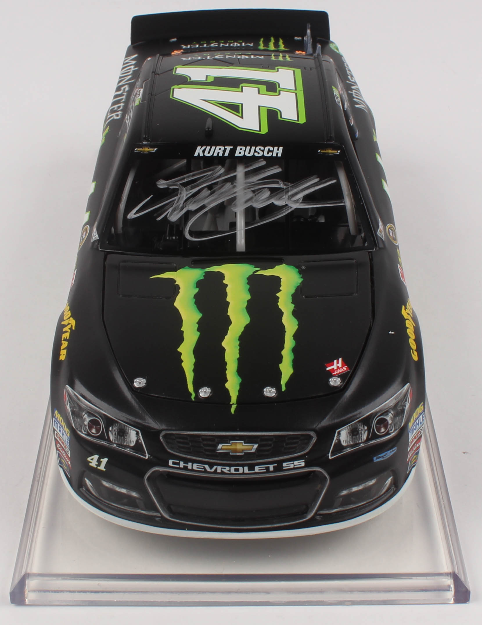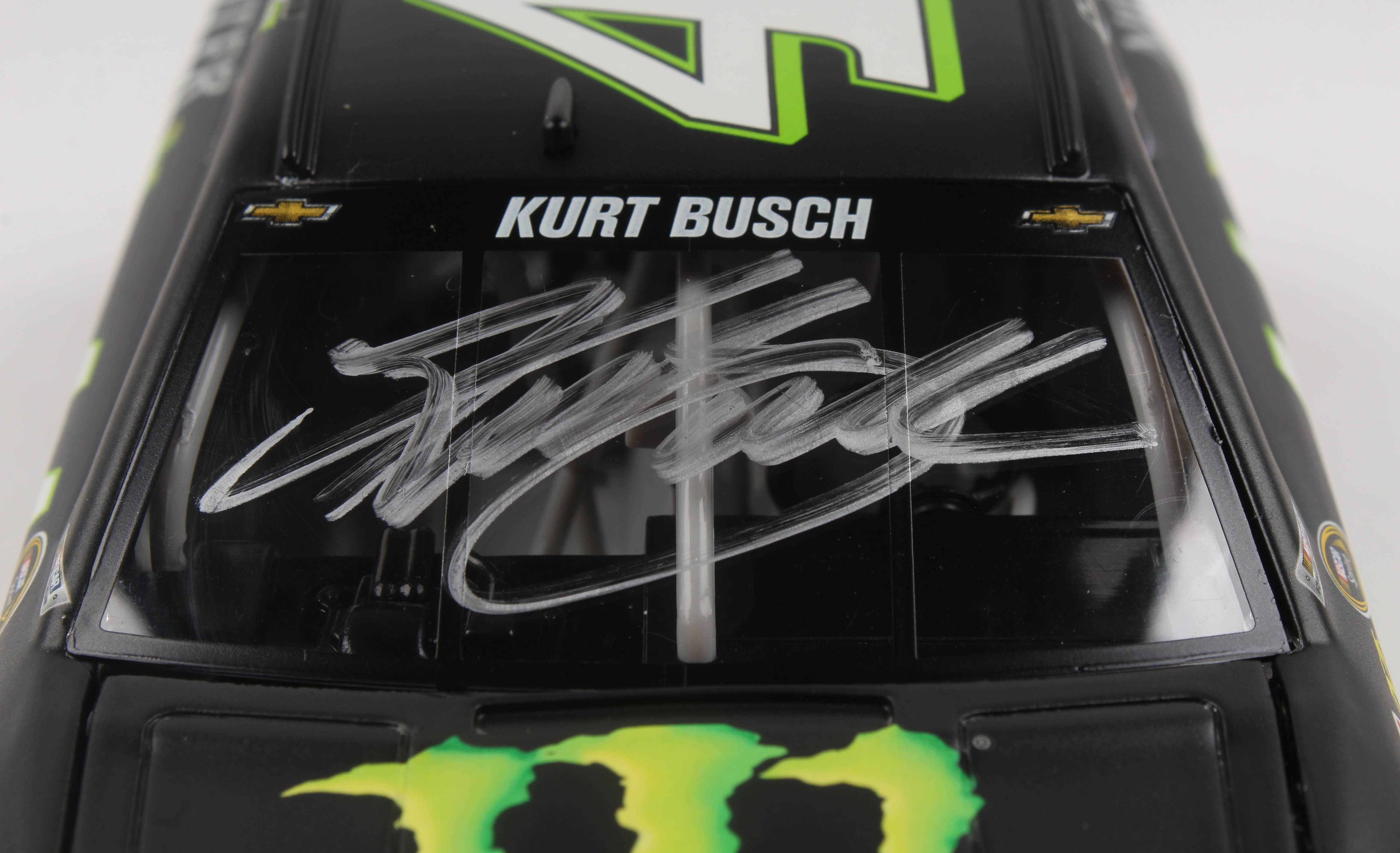 Action Racing Monster Energy Premium die-cast car hand-signed on the windshield in silver paint pen by Kurt Busch. The car is limited edition to just 4,261 produced and includes the original packaging.