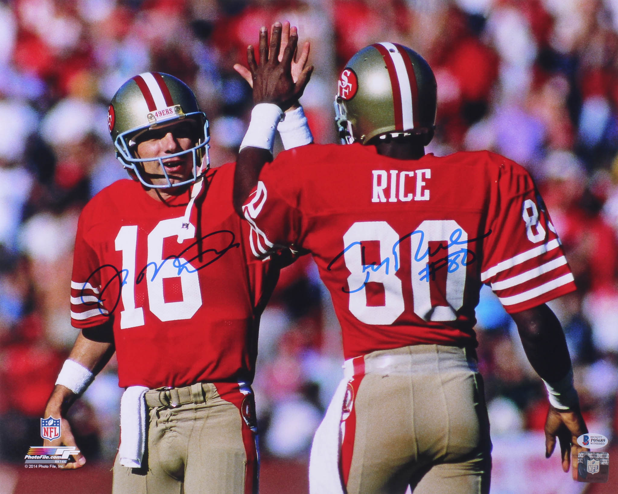 Photo measures 16" x 20" in size and has been hand-signed in blue felt-tip pen by Joe Montana (San Francisco 49ers, HOF) and Jerry Rice (San Francisco 49ers, HOF).